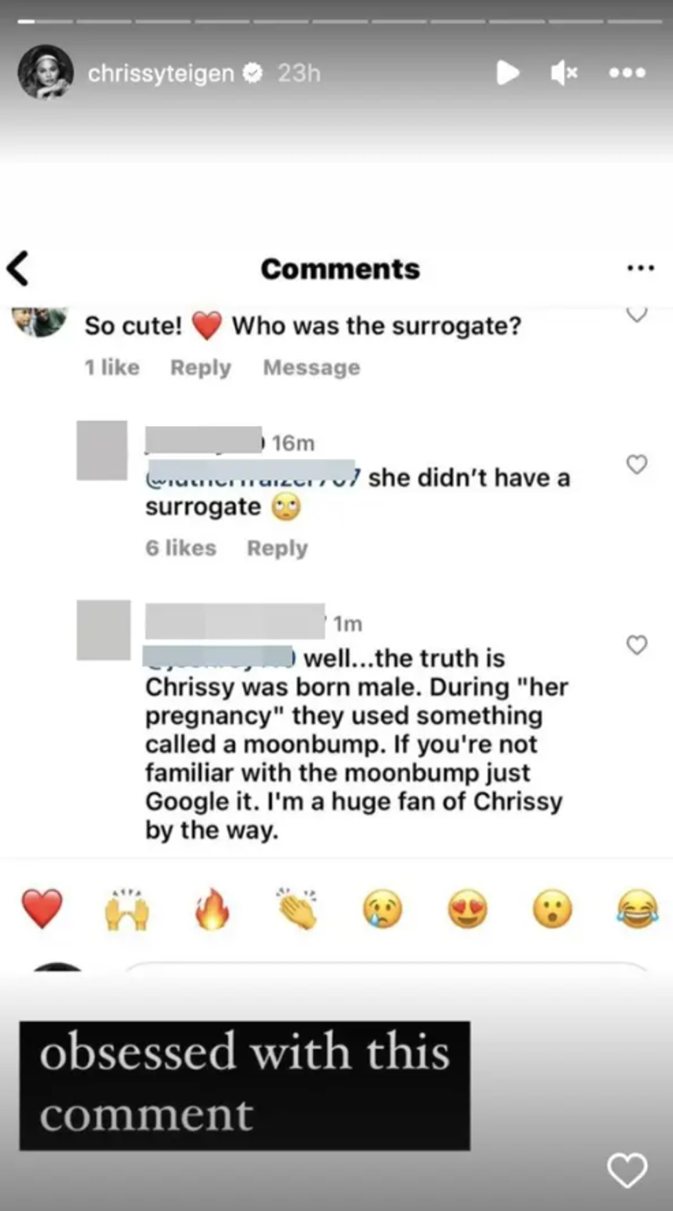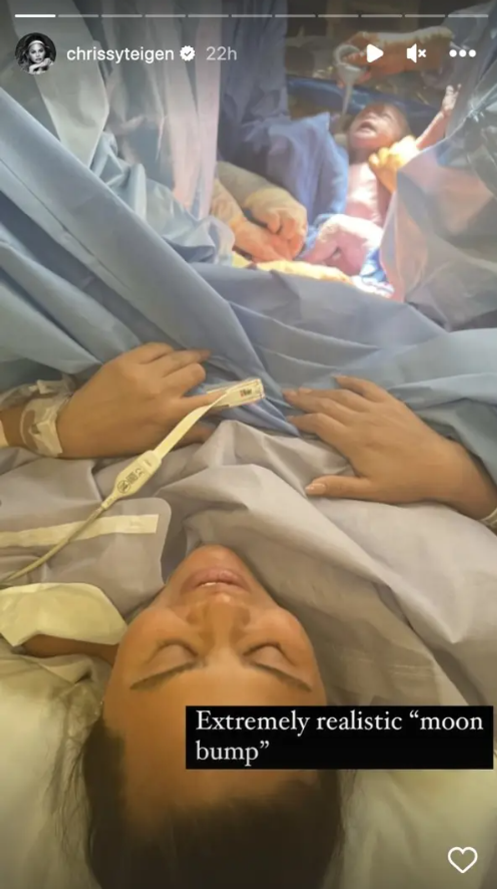 In response to the comment about a surrogate and the moon bump, Teigen shared a picture taken during her c-section.