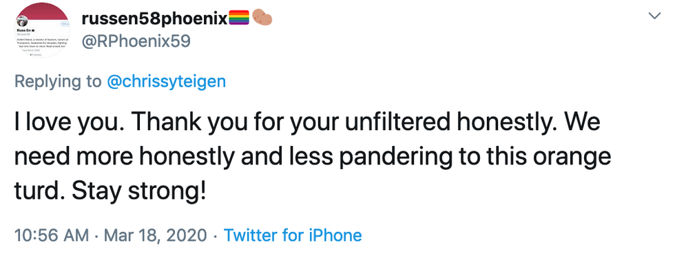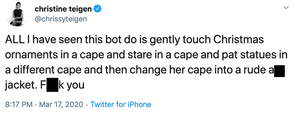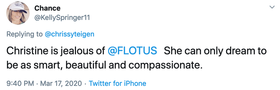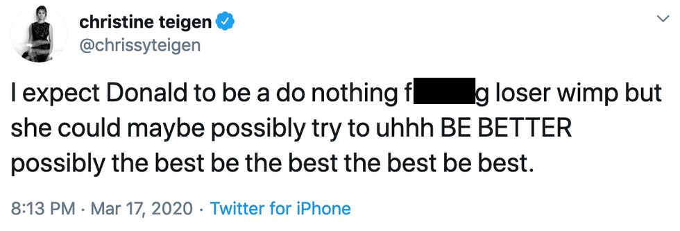But TV personality Chrissy Teigen, an outspoken Trump critic, scoffed at the former model's Twitter post with a series of profanity-laden tweets.