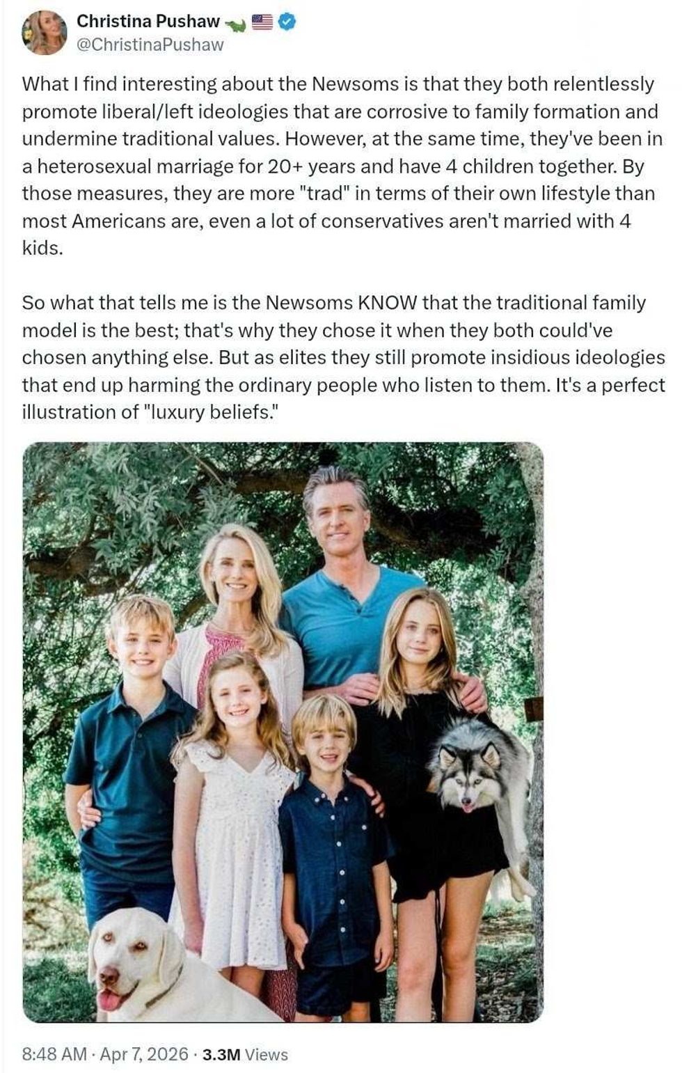 "What I find interesting about the Newsoms is that they both relentlessly promote liberal/left ideologies that are corrosive to family formation and undermine traditional values. However, at the same time, they've been in a heterosexual marriage for 20+ years and have 4 children together. By those measures, they are more 'trad' in terms of their own lifestyle than most Americans are, even a lot of conservatives aren't married with 4 kids."