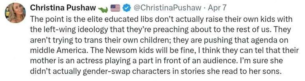 "The point is the elite educated libs don’t actually raise their own kids with the left-wing ideology that they’re preaching about to the rest of us. They aren’t trying to trans their own children; they are pushing that agenda on middle America. The Newsom kids will be fine, I think they can tel that their mother is an actress playing a part in front of an audience. I’m sure she didn’t actually gender-swap characters in stories she read to her sons."