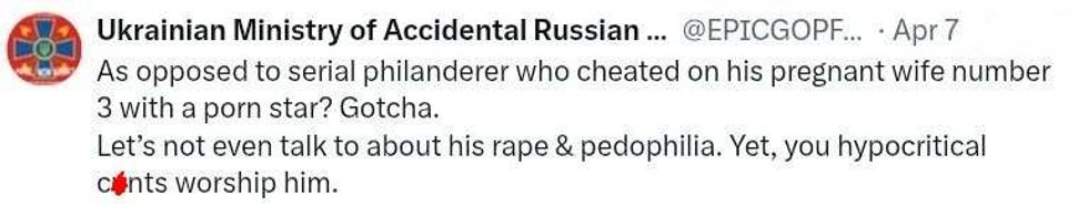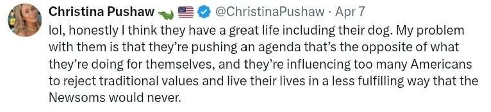 Pushaw claimed, in a post on X, that because Governor Newsom and First Partner Siebel Newsom are in a committed heteronormative marriage with four children, they're hypocrites for any support they show for LGBTQ+ equality and nontraditional families.