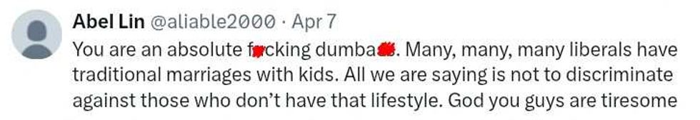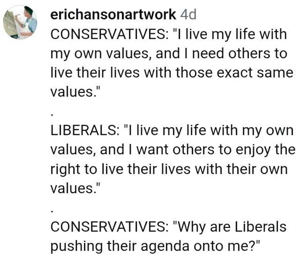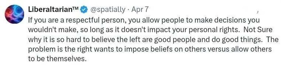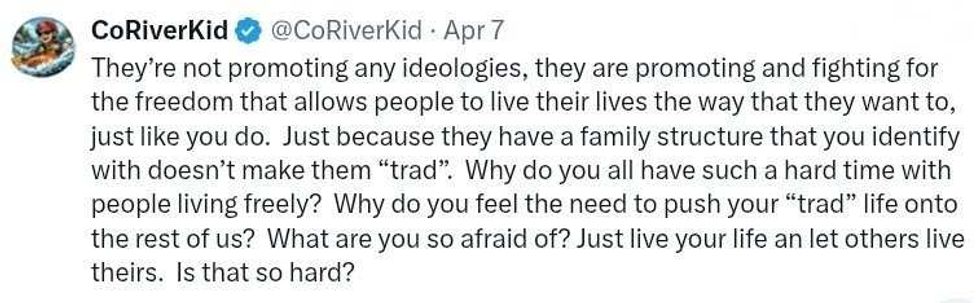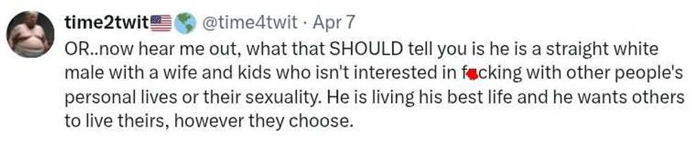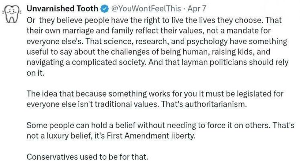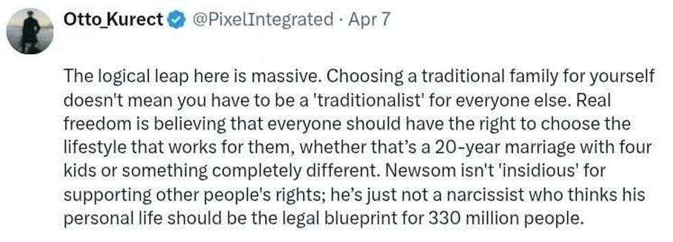 "Here's the thing conservatives never figure out: you can have your big family, your golden retriever, your Sunday roasts, and your white picket fence — and still mind your own damn business about what everyone else does with theirs. Living your values doesn't require legislating everyone else's. The Newsoms aren't out here trying to force you to make documentary films or give your sons dolls. And yet somehow, the people who claim to be all about 'freedom' are the ones most consumed — most miserable — about how strangers they'll never meet choose to live and love."