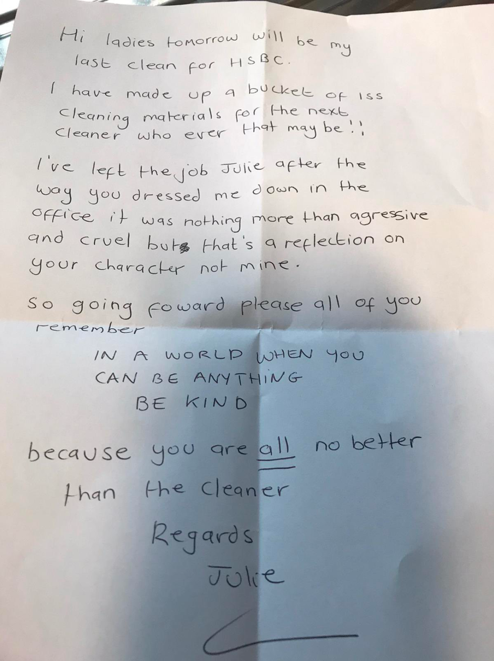 A Southhampton woman who worked as a cleaner at HSBC Banks called it quits and stuck it to her "cruel" boss in the form of a brutally honest letter.
