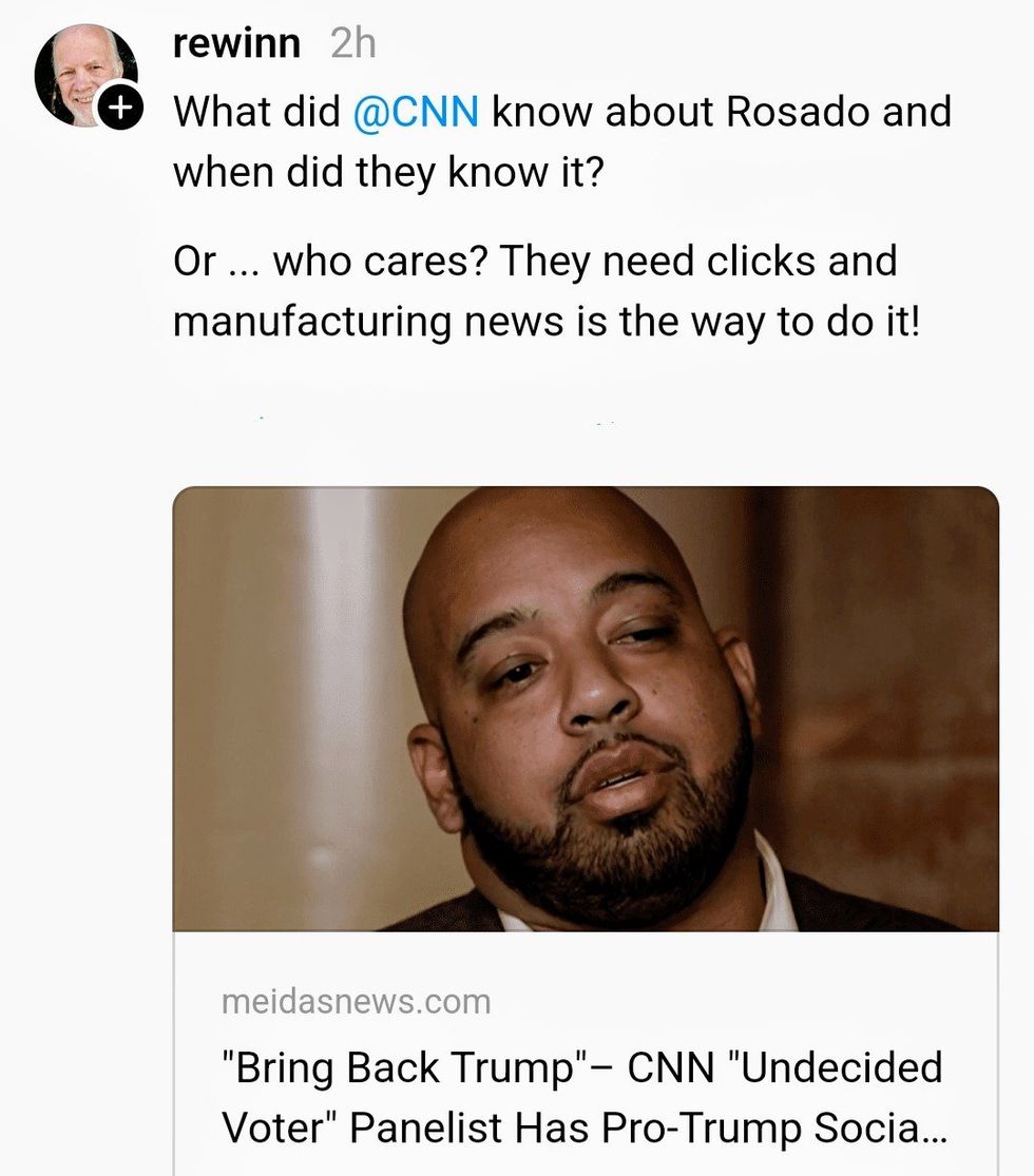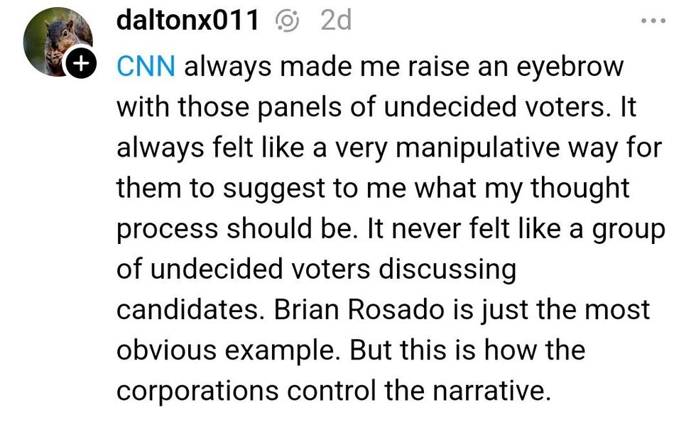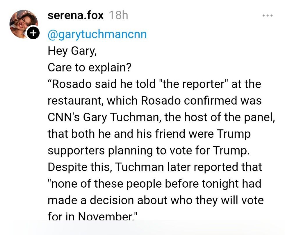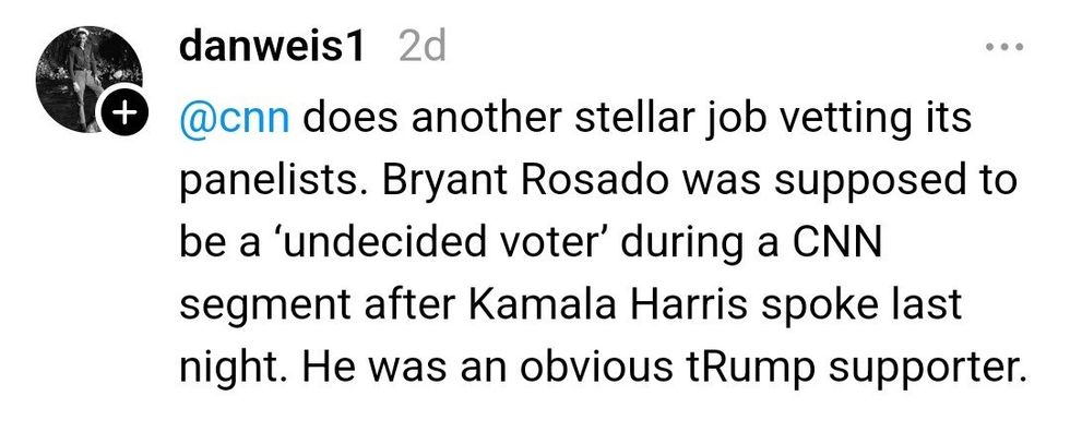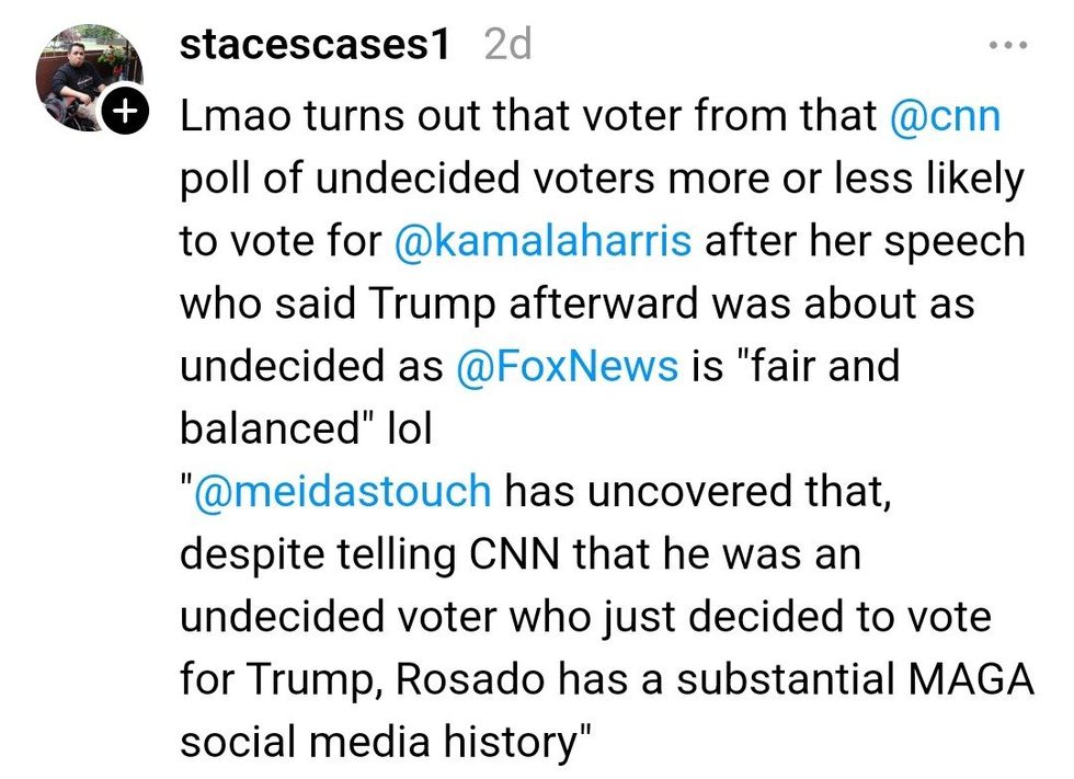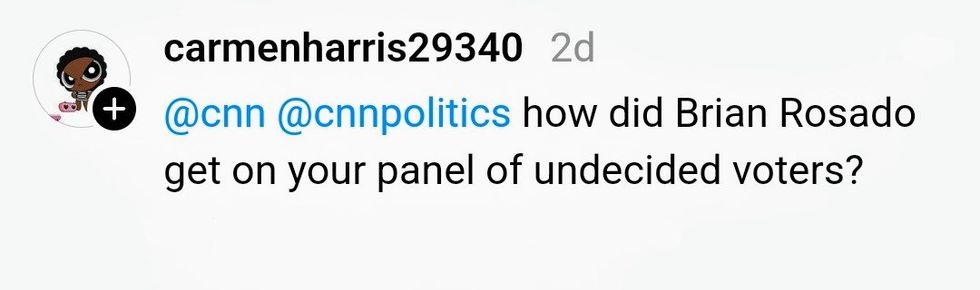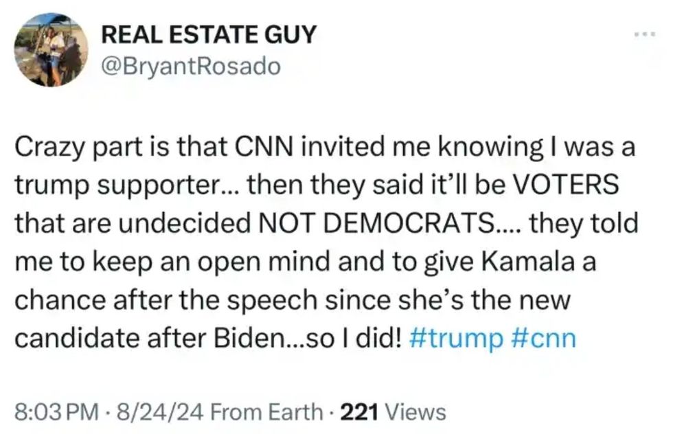 "Crazy part is that CNN invited me knowing I was a trump supporter... then they said it'll be VOTERS that are undecided NOT DEMOCRATS... they told me to keep an open mind and to give Kamala a chance after the speech since she's the new candidate after Biden...so I did!"
