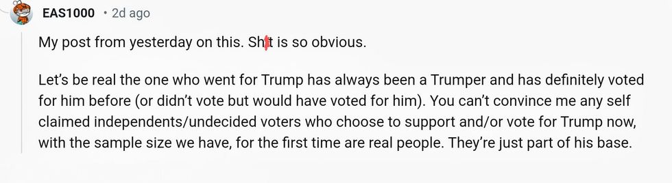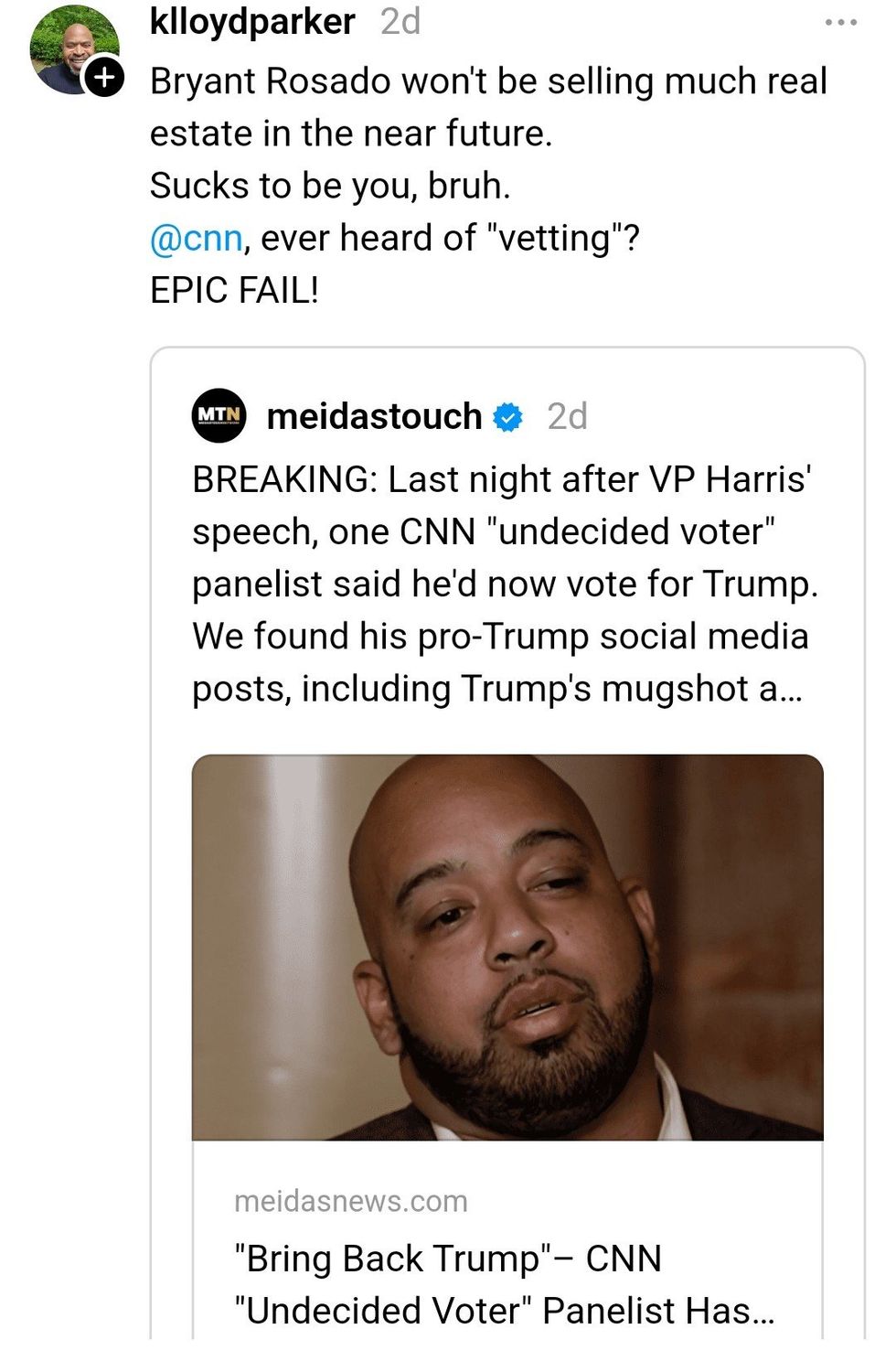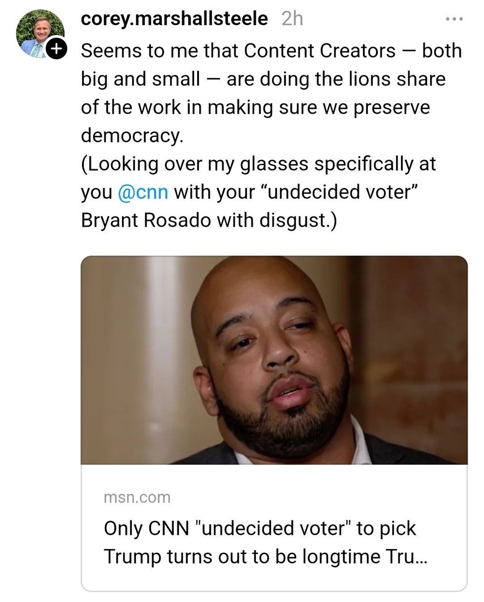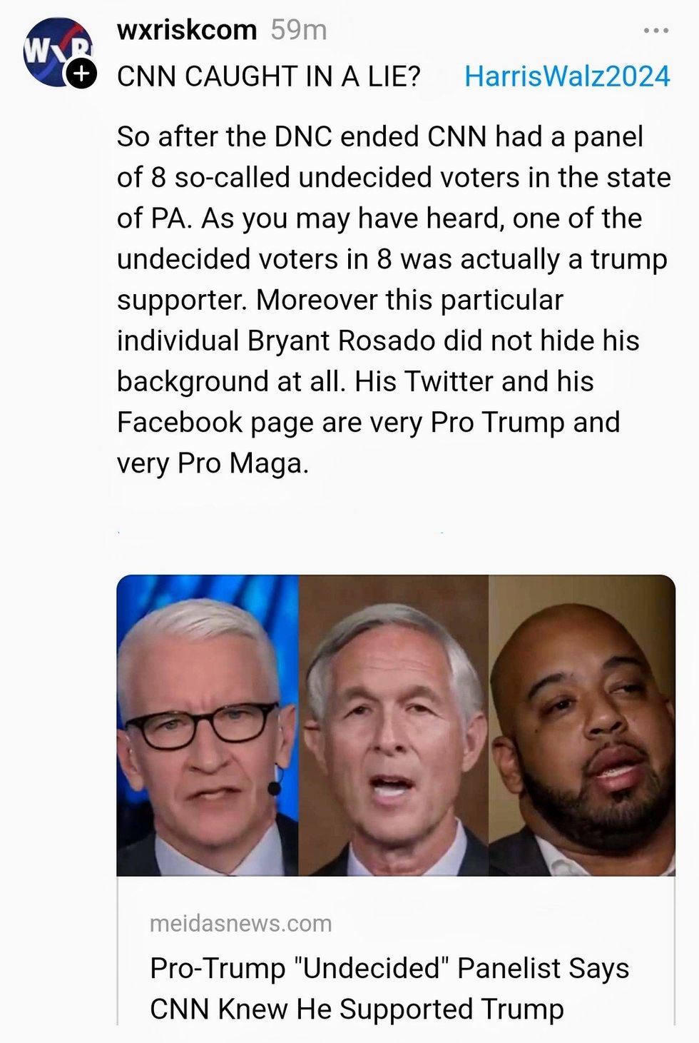 "Crazy part is that CNN invited me knowing I was a trump supporter... then they said it'll be VOTERS that are undecided NOT DEMOCRATS... they told me to keep an open mind and to give Kamala a chance after the speech since she's the new candidate after Biden...so I did!"