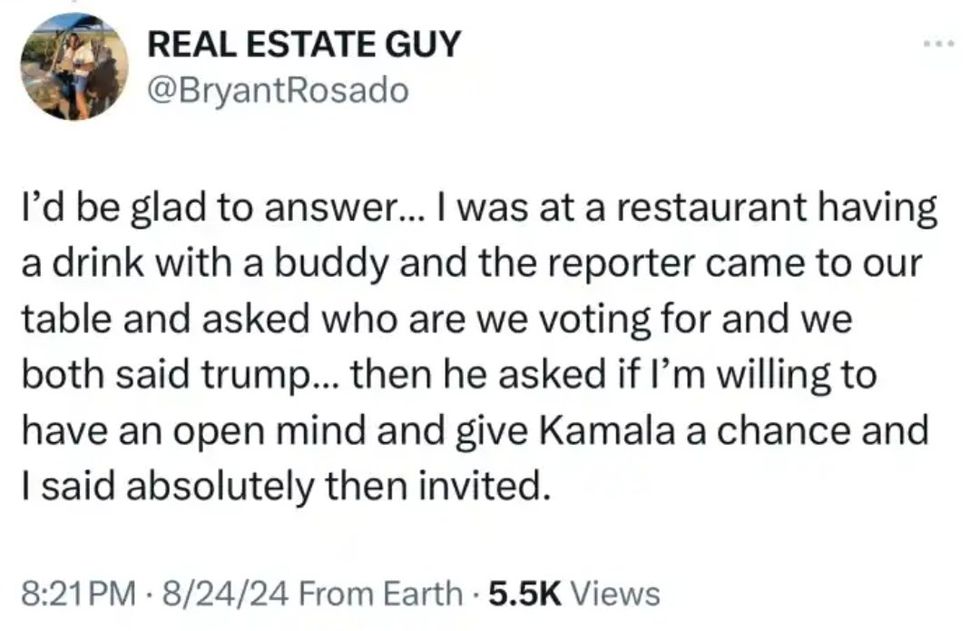 "I'd be glad to answer... I was at a restaurant having a drink with a buddy and [CNN's Gary Tuchman] came to our table and asked who are we voting for and we both said trump... then he asked if I'm willing to have an open mind and give Kamala a chance and I said absolutely then invited."