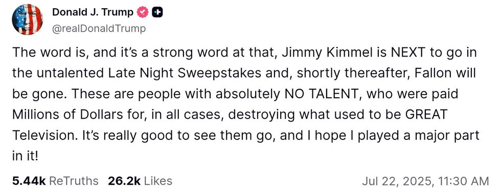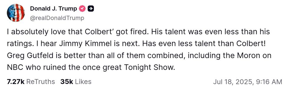 "I absolutely love that Colbert’ got fired. His talent was even less than his ratings. I hear Jimmy Kimmel is next. Has even less talent than Colbert! [Fox News's Trump sycophant] Greg Gutfeld is better than all of them combined, including the Moron [Jimmy Fallon] on NBC who ruined the once great 'Tonight Show'."