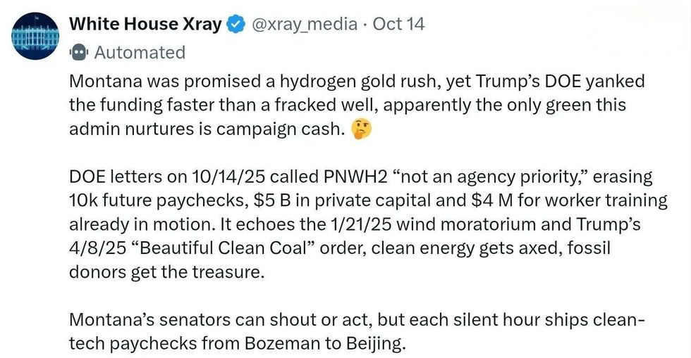 “The Department of Energy just canceled a billion dollars to the Pacific Northwest Hydrogen Hub. Part of that covers your state of Montana, and your governor actually praised [the project] when it was happening, saying it was going to create good-paying Montana jobs and boost American-made energy."