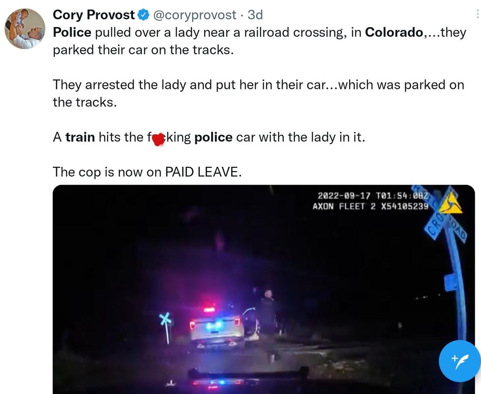 \u201cWHAT THE HECK!? Who parks their car on train tracks????? Fort Lupton Police Department of Colorado \ud83d\ude21\n\nA woman was handcuffed in the back of a cop car \ud83d\ude93 and then hit by a train!\n\nWhat consequences come with this cops brainless act?\u201d— Mahdi\ud83e\udd40, MPH, MSBA (@Mahdi\ud83e\udd40, MPH, MSBA) 1664223872