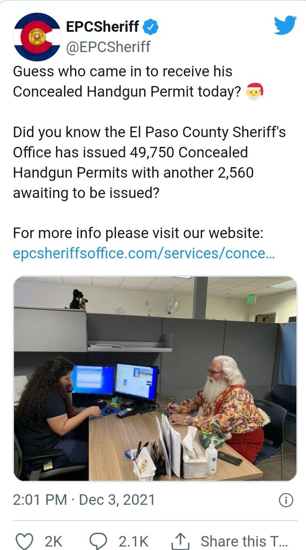 The El Paso County Sheriff shared the photo, in which a portly Santa Claus was registering for a concealed carry authorization, along with statistics about gun ownership in the county that struck many gun control advocates as excessive.