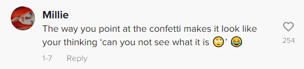 Jen then gestured at the bright pink confetti drifting back down to the floor, confused for a moment about why her boyfriend wasn't getting it.