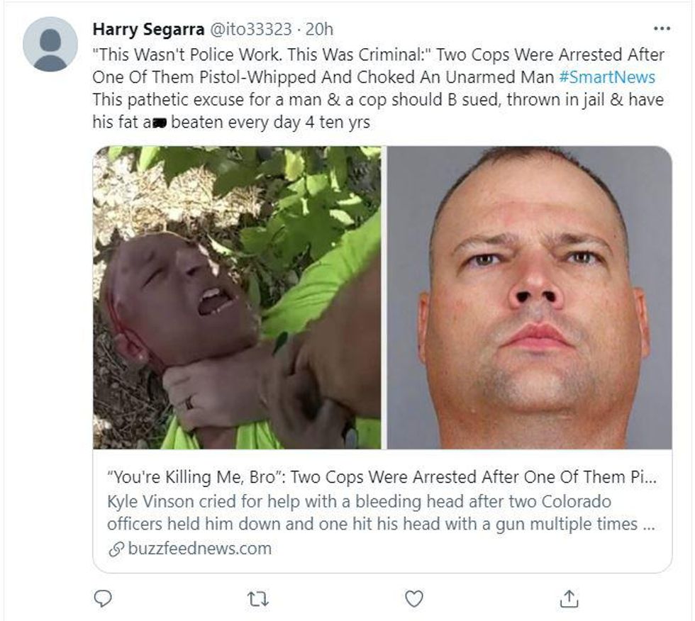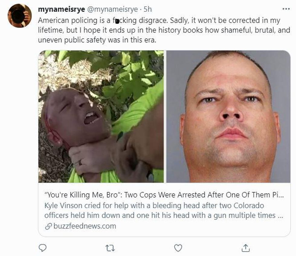 Fire Them Both \u2014 \u201cYou're Killing Me, Bro\u201d: Two Cops Were Arrested After One Of Them Pistol-Whipped And Choked An Unarmed Manhttps://www.buzzfeednews.com/article/tasneemnashrulla/aurora-police-arrested-pistol-whipping-choking\u00a0\u2026— Carl Kuzmich (@Carl Kuzmich) 1627509971