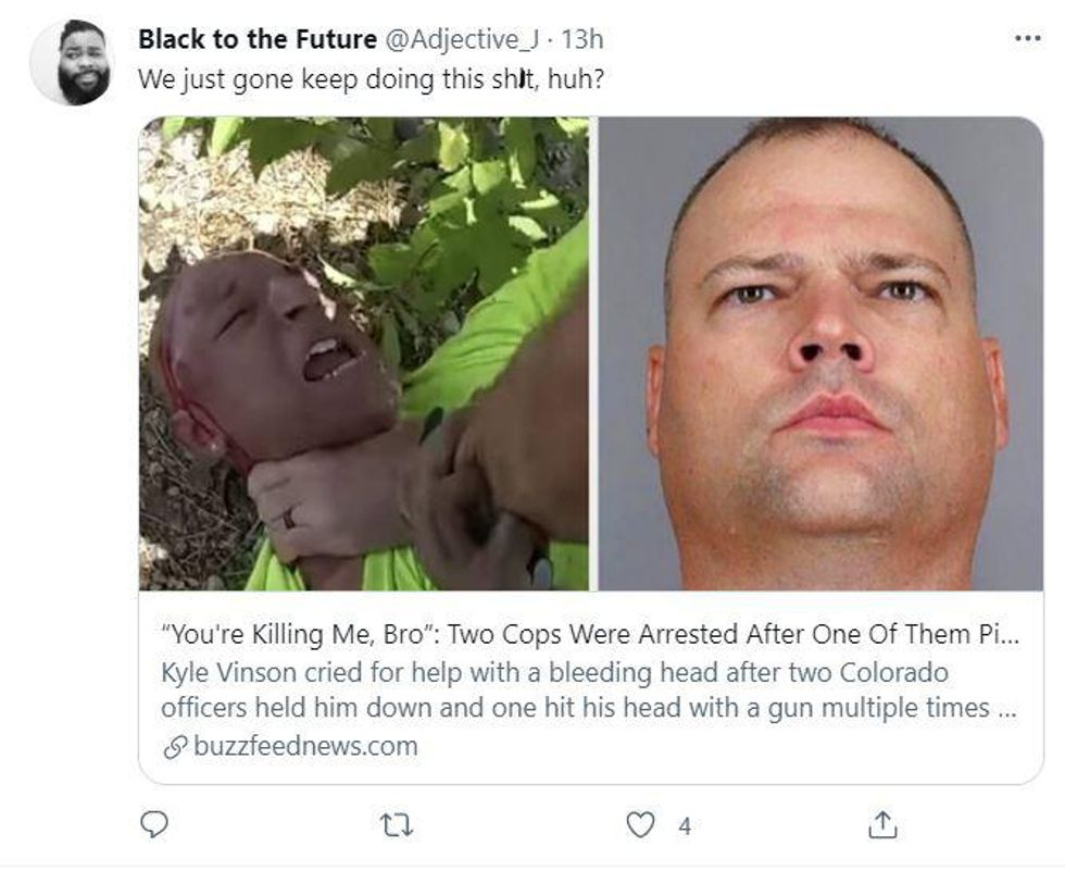 Unarmed Blk. man once again faces deadly force. \n\nHow can only 25% of wht. Americans get this? \nWake up! #BlackLivesMatter.\n\n\u201cYou're Killing Me, Bro\u201d: Two Cops Were Arrested After One Of Them Pistol-Whipped And Choked An Unarmed Man https://www.buzzfeednews.com/article/tasneemnashrulla/aurora-police-arrested-pistol-whipping-choking\u00a0\u2026 via @TasneemN— margie norris (@margie norris) 1627539763