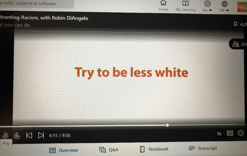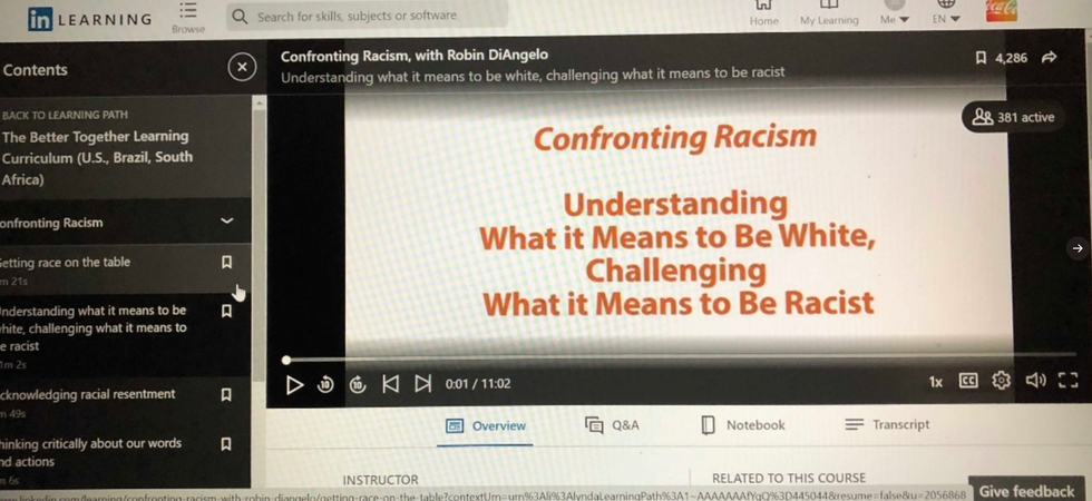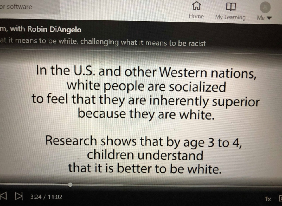An internal whistleblower screenshot several slides of the training curriculum from a public LinkedIn Learning seminar on "Confronting Racism, with Robin DiAngelo."