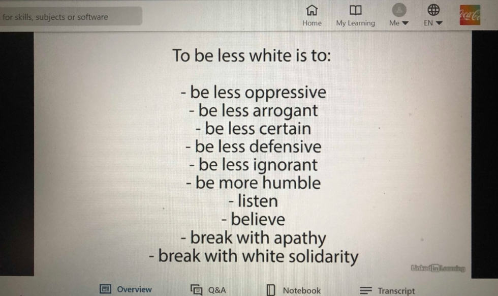 "BREAKING: Coca-Cola is forcing employees to complete online training telling them to 'try to be less white.' These images are from an internal whistleblower:"