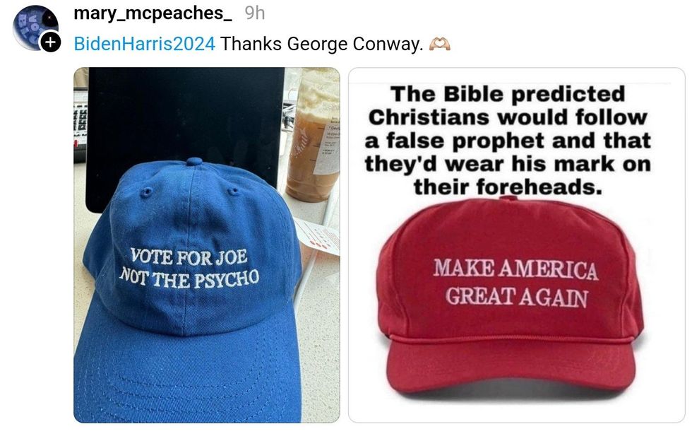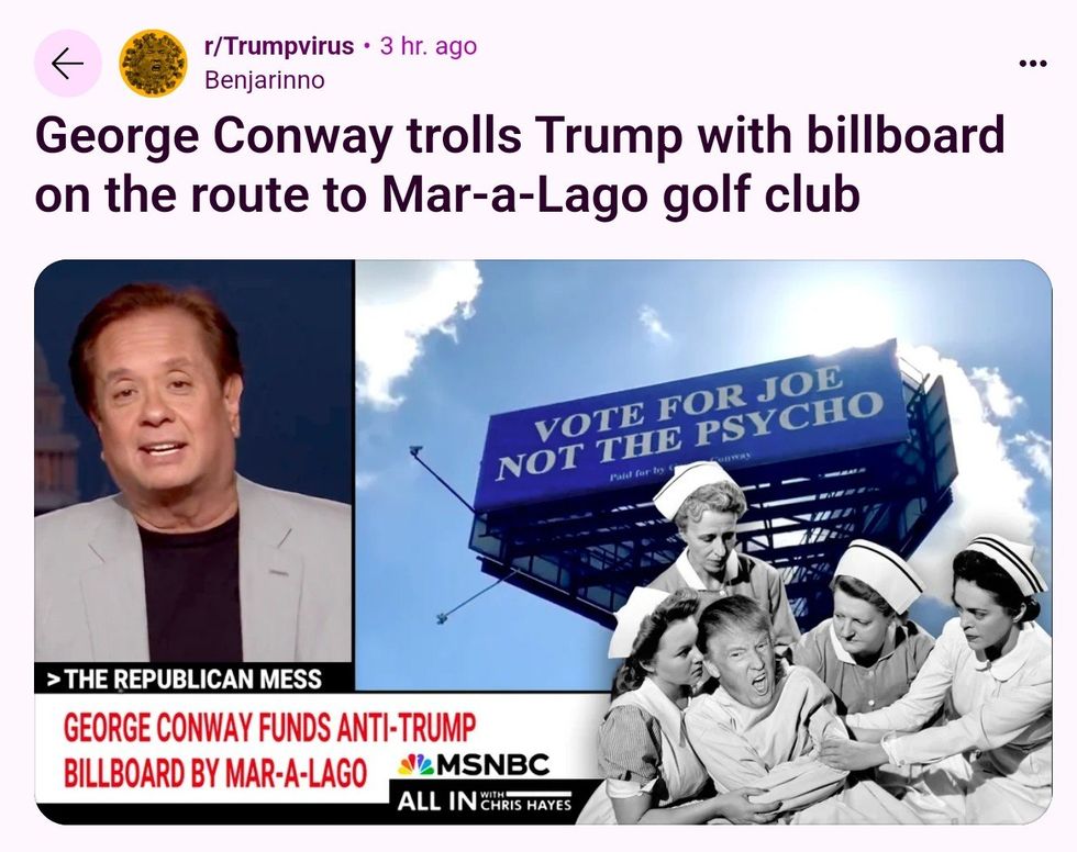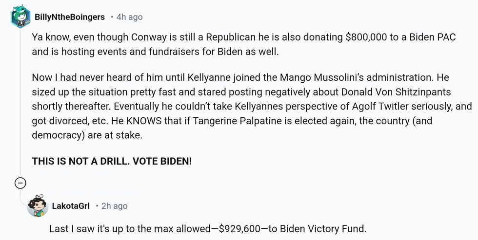 In addition to donating the maximum allowed of $929,600 to the Biden Victory Fund, Conway rented a billboard on I-95 near Palm Beach, Florida—home of Trump's Mar-a-Lago resort—just in time for the first long weekend of the summer travel season.