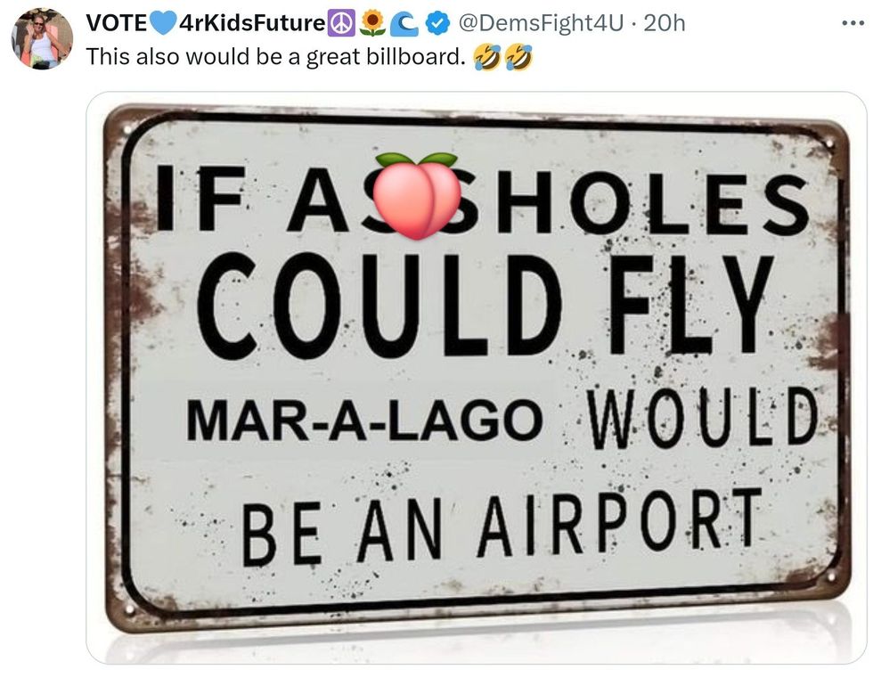 So, just for kicks, I put up a billboard a few miles south of Palm Beach on I-95 South, perfect for anyone happening to travel from Mar-a-Lago to Doral to, say, play golf. Right around Exit 64, I believe. They’re going to send me better photos later. pic.twitter.com/NgPvkhT3Bw