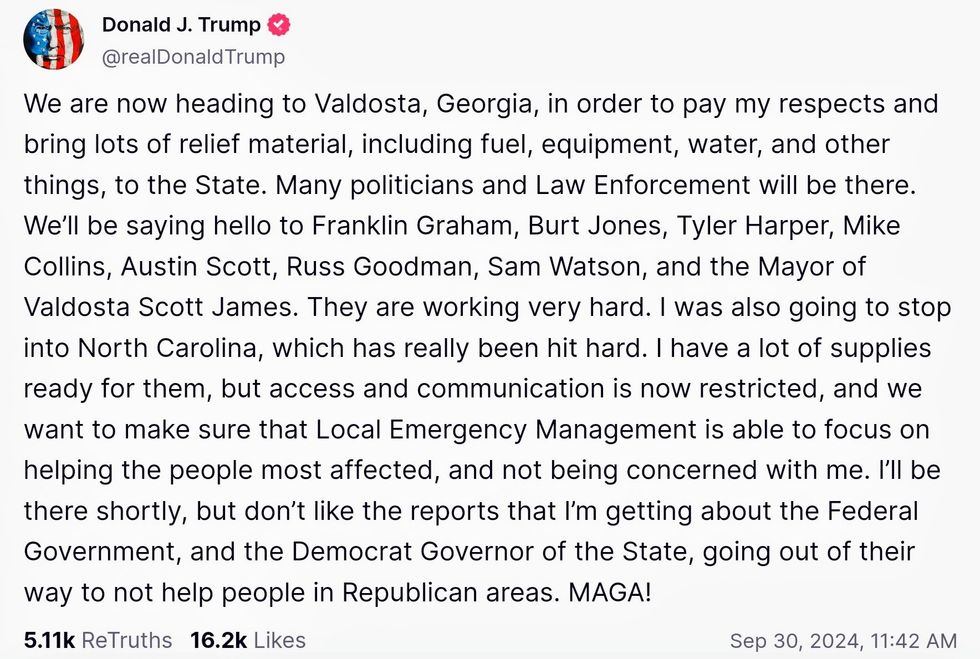In the same post, Trump also falsely claimed Biden and Harris "left Americans to drown."