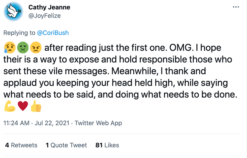 Bush shared several other tweets either threatening or wishing her and her family death, citing her views about racial justice as justification, even going so far as to call Bush herself a racist for supporting basic human rights and equality.