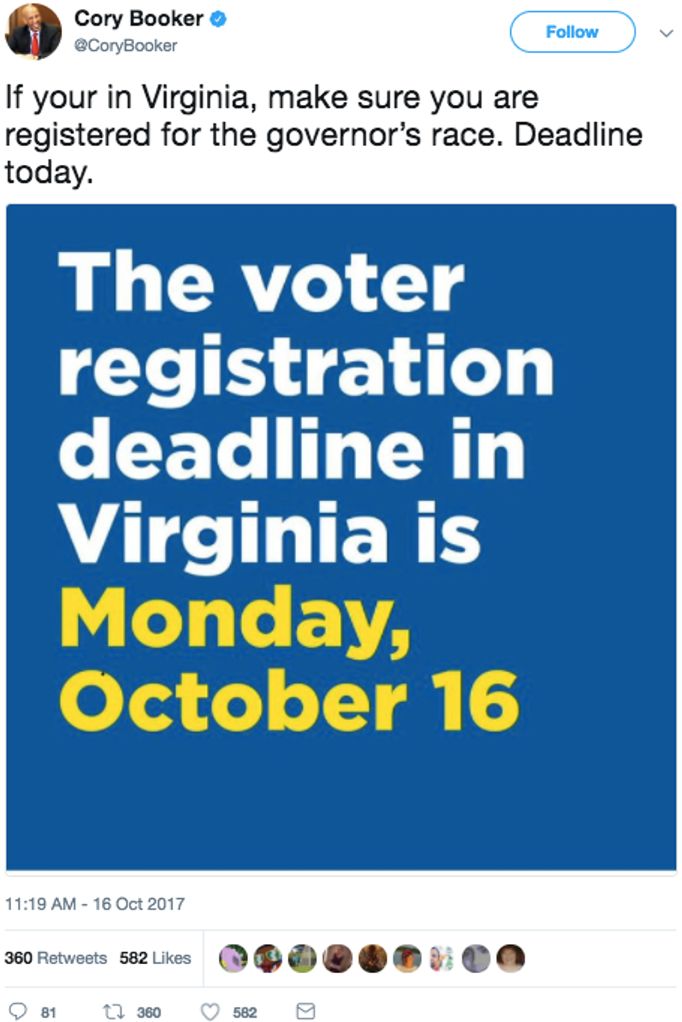 Another tweet said, "If your in Virginia, make sure you are registered for the governor’s race. Deadline today," using the wrong form of "you're," and sending shivers down the spines of grammarians everywhere.