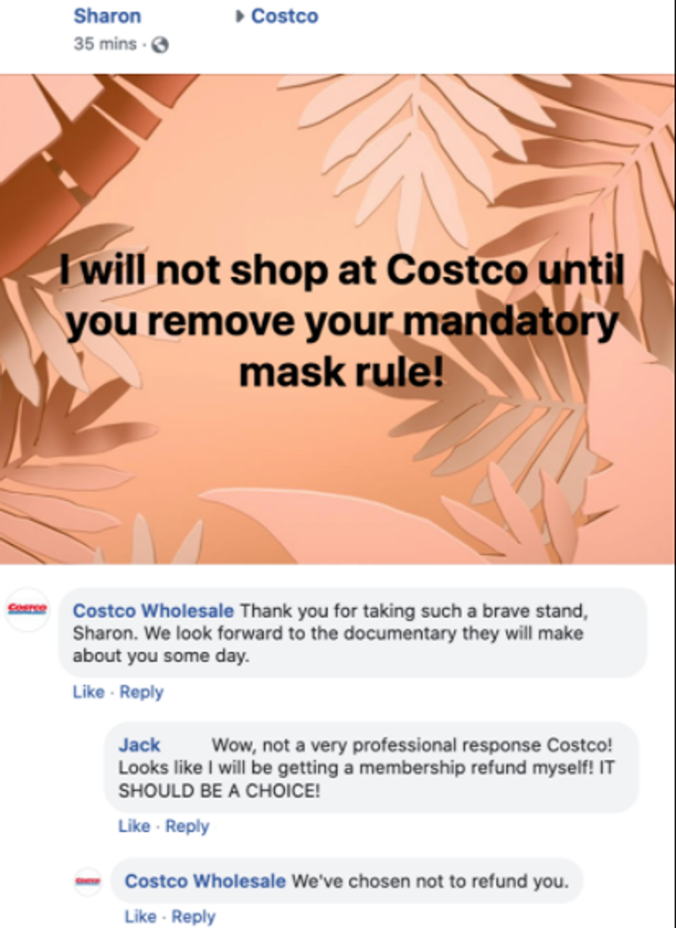 Comments on the post featured a fair amount of people congratulating Costco for the company's conviction. Apparently those folks didn't get the memo.