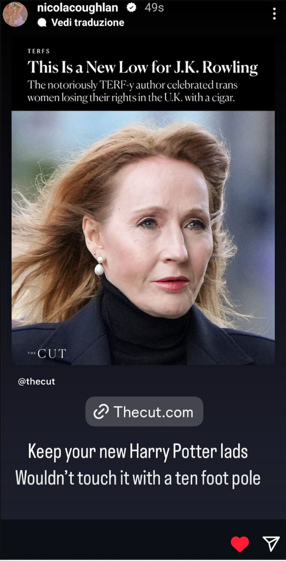 In a since-deleted Instagram Story, Coughlan posted an article from The Cut about the Supreme Court decision, titled "This Is A New Low for JK Rowling," along with the caption: