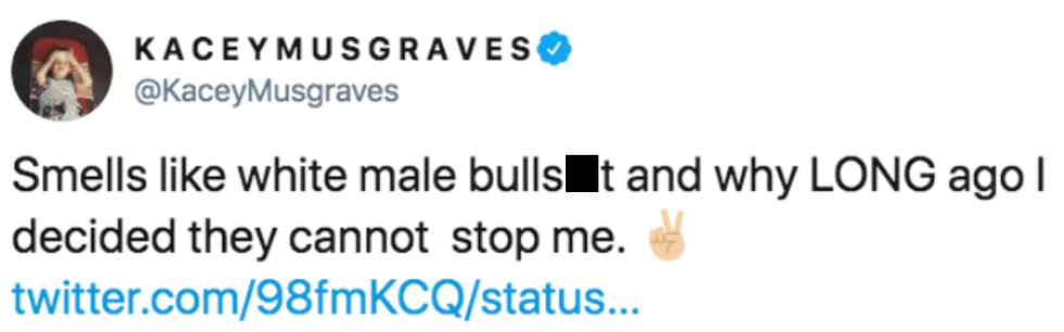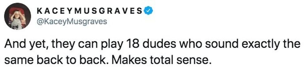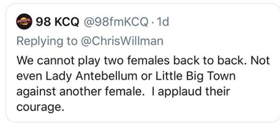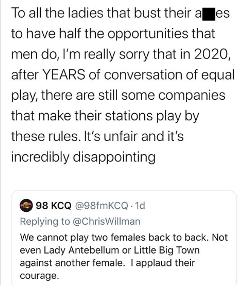 "I say this having been one of the few women who have been really embraced by country radio and having watched some of the bigger networks (and some of my friends that are pd's and high up) make real changes in their programming to make it look more balanced. I am grateful. BUT. there is still inequality in airplay for women. And tweets like this prove it."