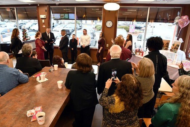 Valerie Sneade and Jason Roy were married on Friday, joined by family, friends and customers buying coffee and pastries at the Dunkin' Donuts in Grafton Street in Worcester, Massachusetts.