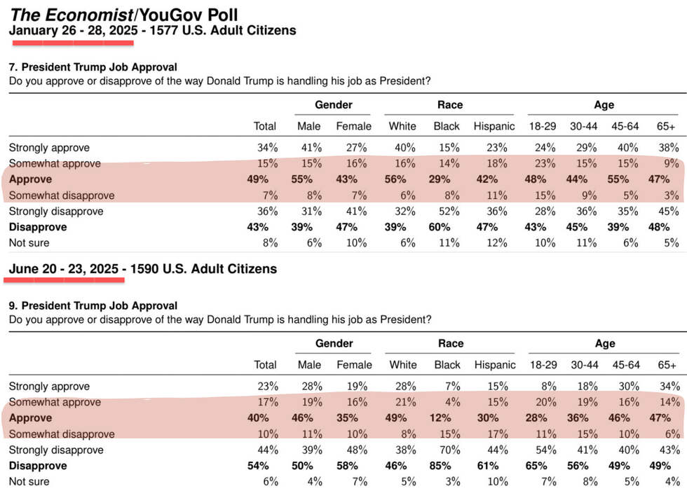 More significant is that the poll shows no demographic giving Trump even a 50% approval rating, with the biggest popularity plunge among people age 18-29.