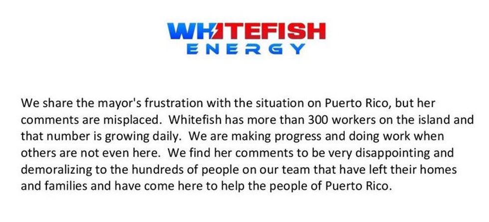 Whitefish Energy, which reportedly employed only two full-time employees when the contract was awarded, said it shared Cruz's frustrations but in an attached image on their letterhead called her comments "disappointing", "demoralizing", and "misplaced".