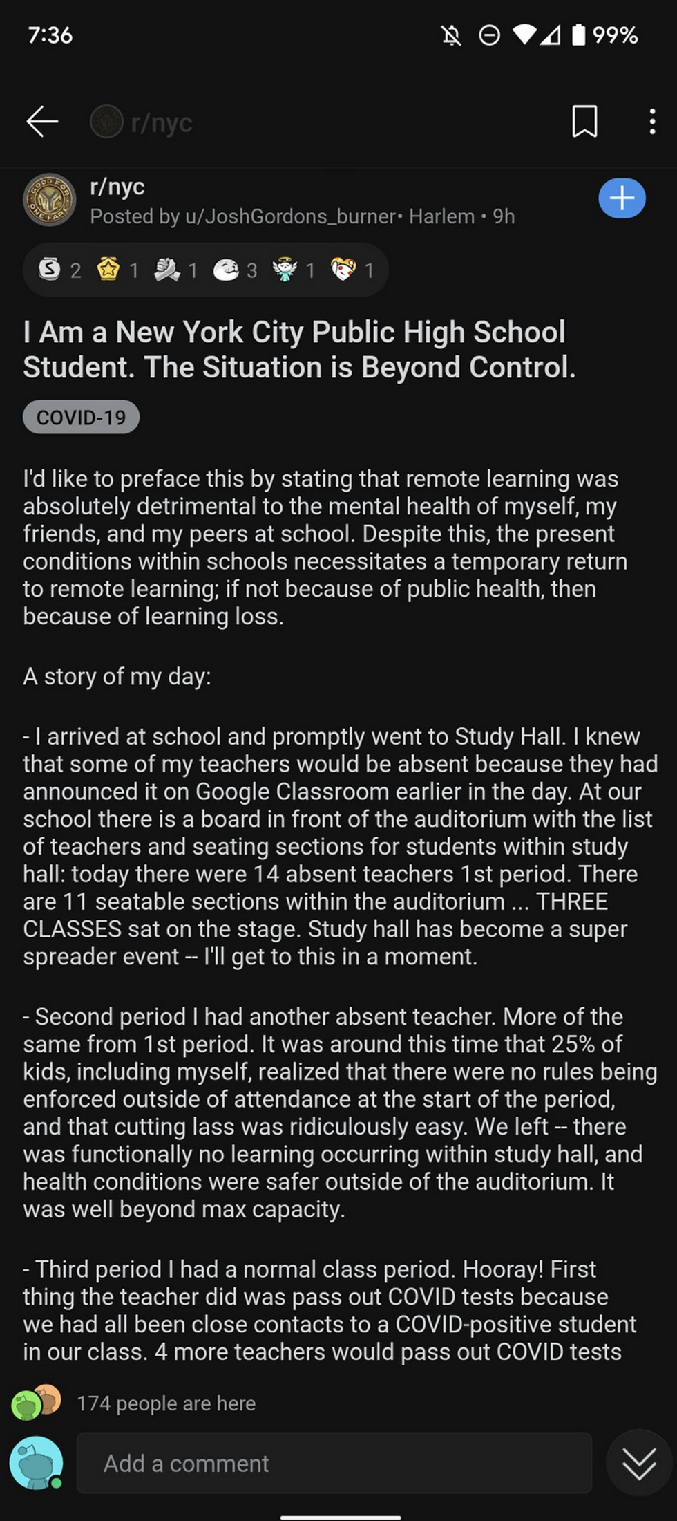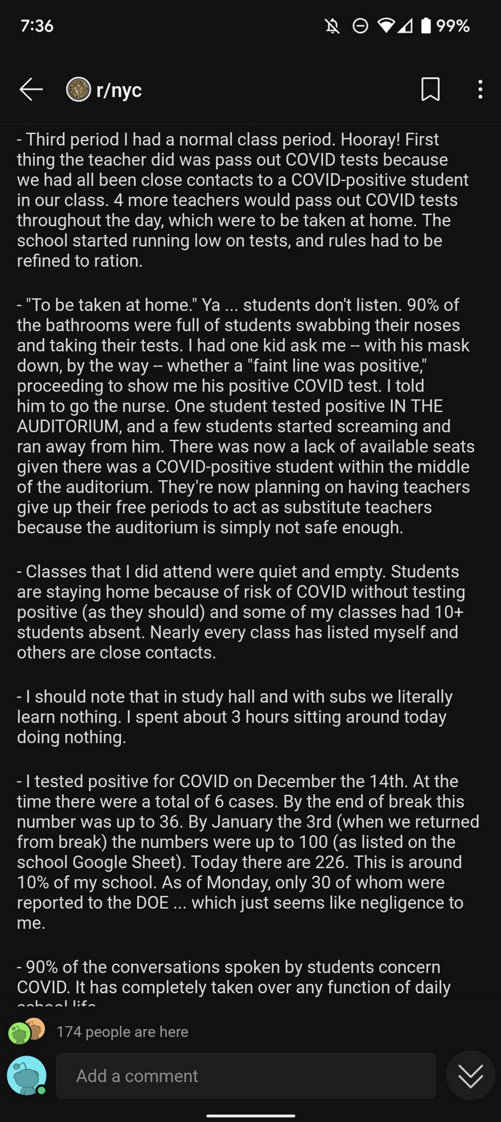 School is chaotic babysitting right now, not education. Nearly my entire class is positive & I\u2019m supposed to keep showing up while my students are home - without a remote teacher- so that I can sub for absent teachers or until I get sick. Swagger & safety theatre are dangerous.— Concerned Citizen, MS.Ed. (@Concerned Citizen, MS.Ed.) 1641661312