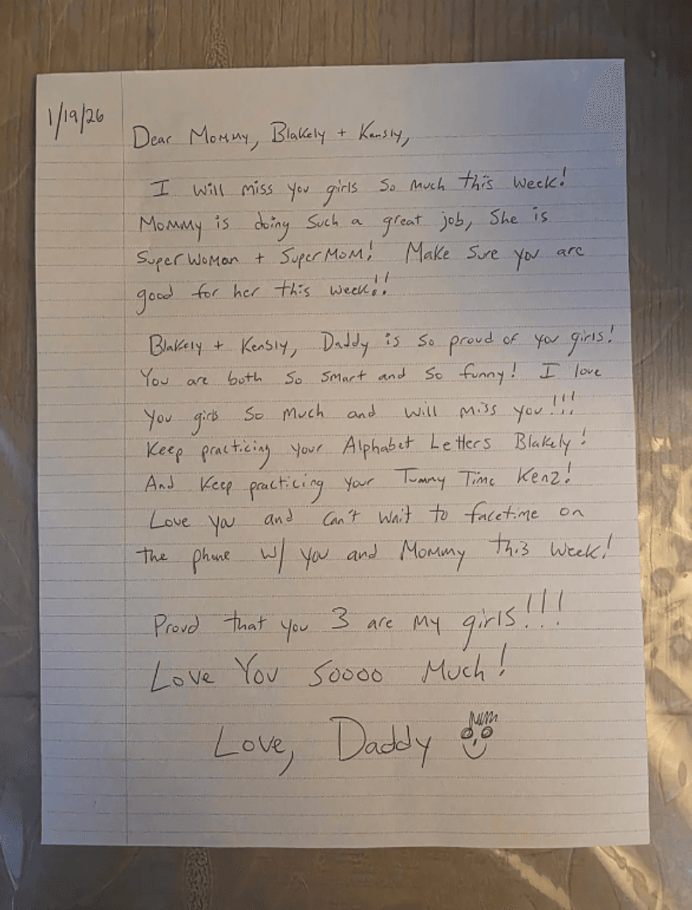 "I will miss you girls so much this week! Mommy is doing such a great job. She is Superwoman and Supermom! Make sure you are good for her this week!"