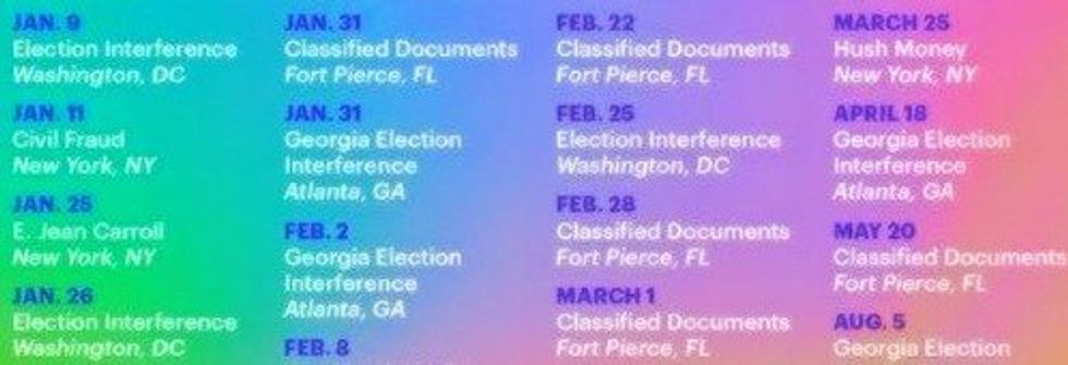 The poster features Trump's 2024 court dates, locations, and indicted criminal offenses or civil actions.