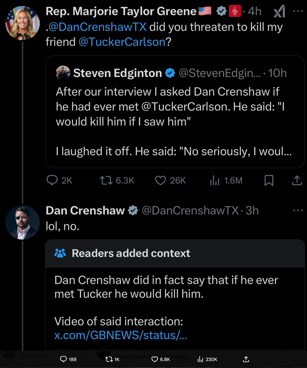 When far-right Georgia Representative Marjorie Taylor Greene read Edginton's recollection of Crenshaw's statement on X, she tagged her fellow lawmaker and asked him if he threatened "to kill my friend @TuckerCarlson?"