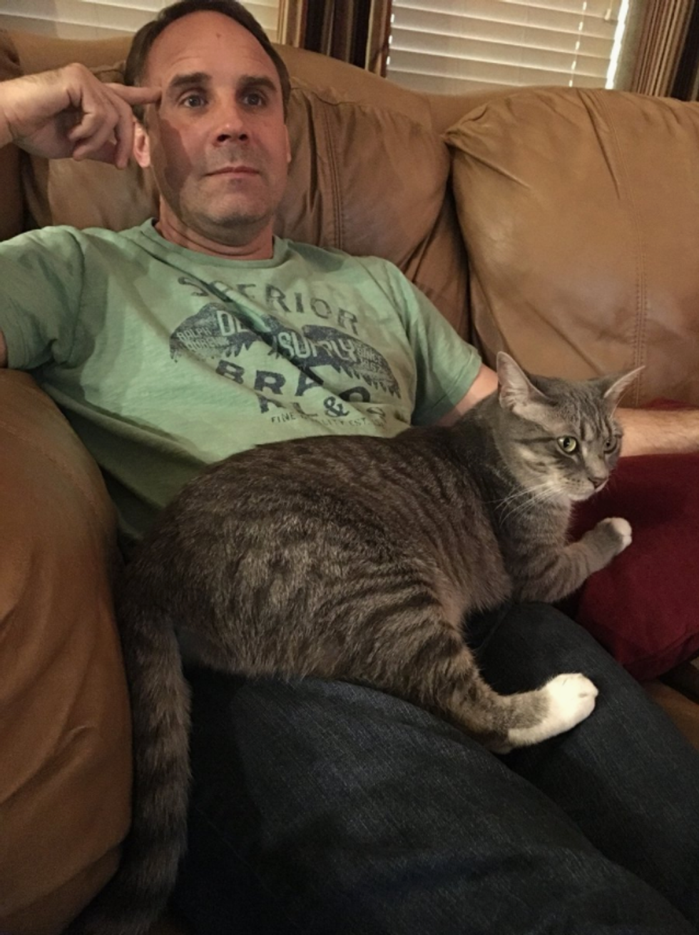 That is one pleased cat, and one bewildered father.
