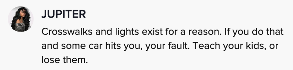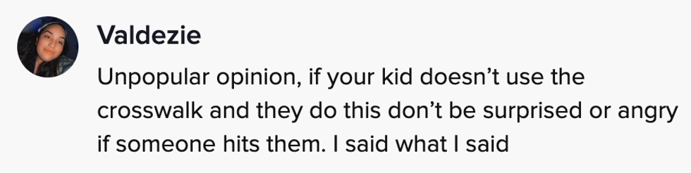"Unpopular opinion, if your kid doesn't use the crosswalk and they do this don't be surprised or angry if someone hits them. I said what I said."