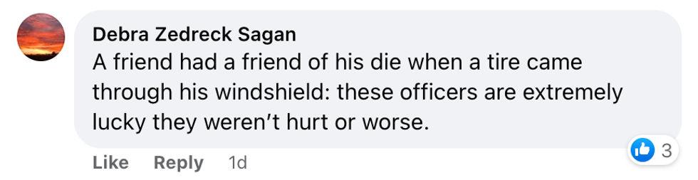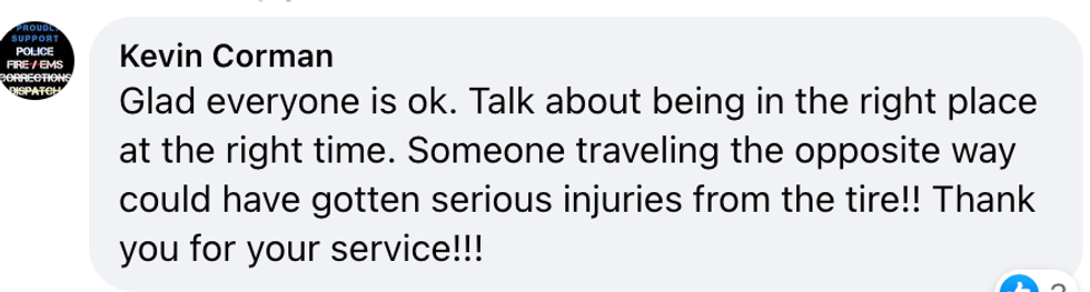 "Luckily, the tire struck the cruiser and then launched in the air to the opposite side of the road, instead of traveling into the opposite lane and striking a moving vehicle coming in the other direction."