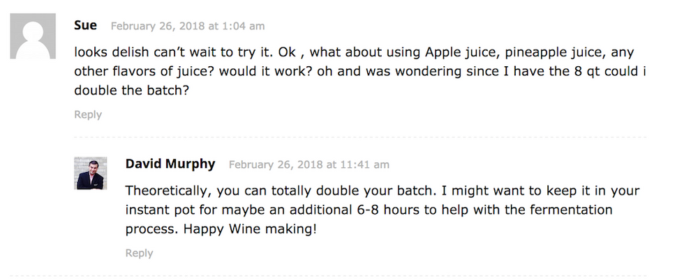We'll take it! The food blogger shared the recipe that includes a 64 oz bottle of grape juice, 1 cup of sugar, 1 packet of red wine yeast, and a funnel. Even though it seems simple to make, Murphy did warn that the process will require some patience for your instant pot wine.