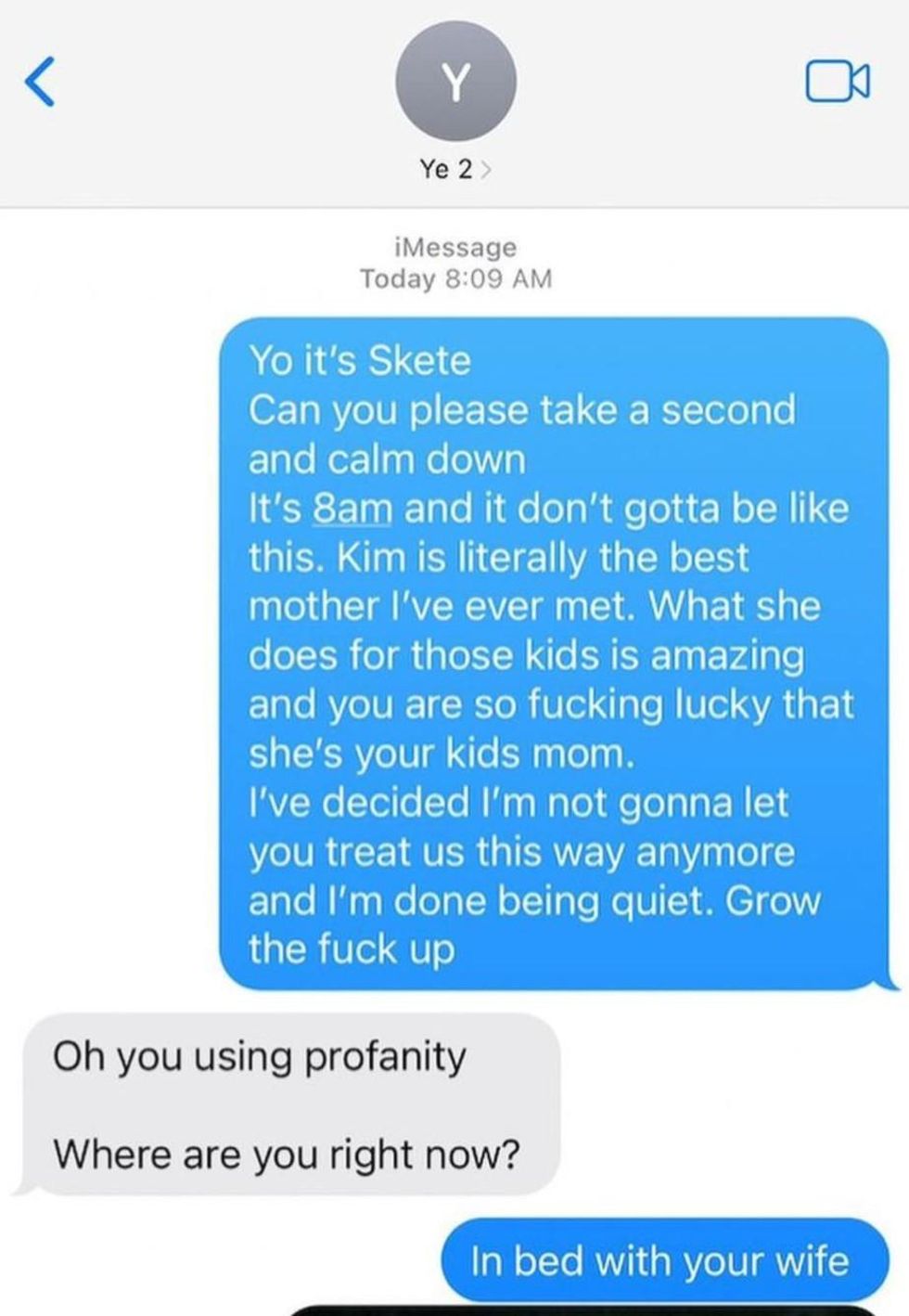 Ye asked Davidson where he was at the moment, and Davidson replied "In bed with your wife" along with a selfie as proof.