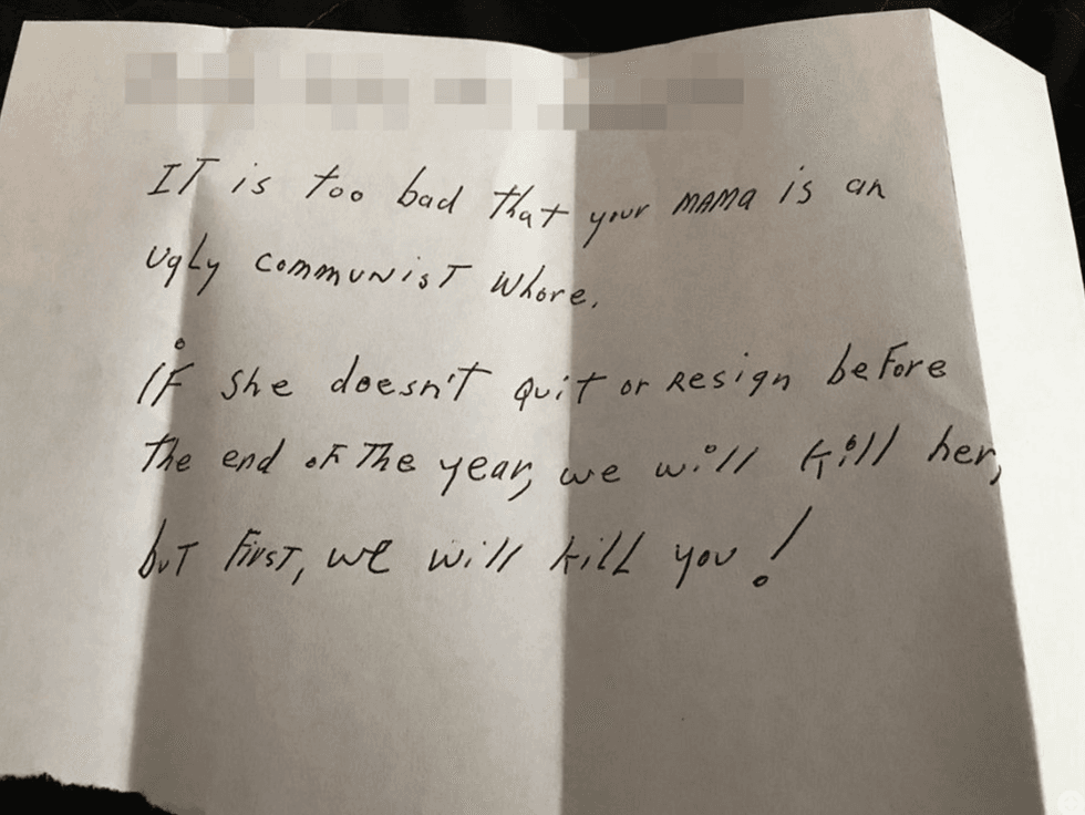 The sender addressed the child and threatened death unless Sheridan stepped down from the board.