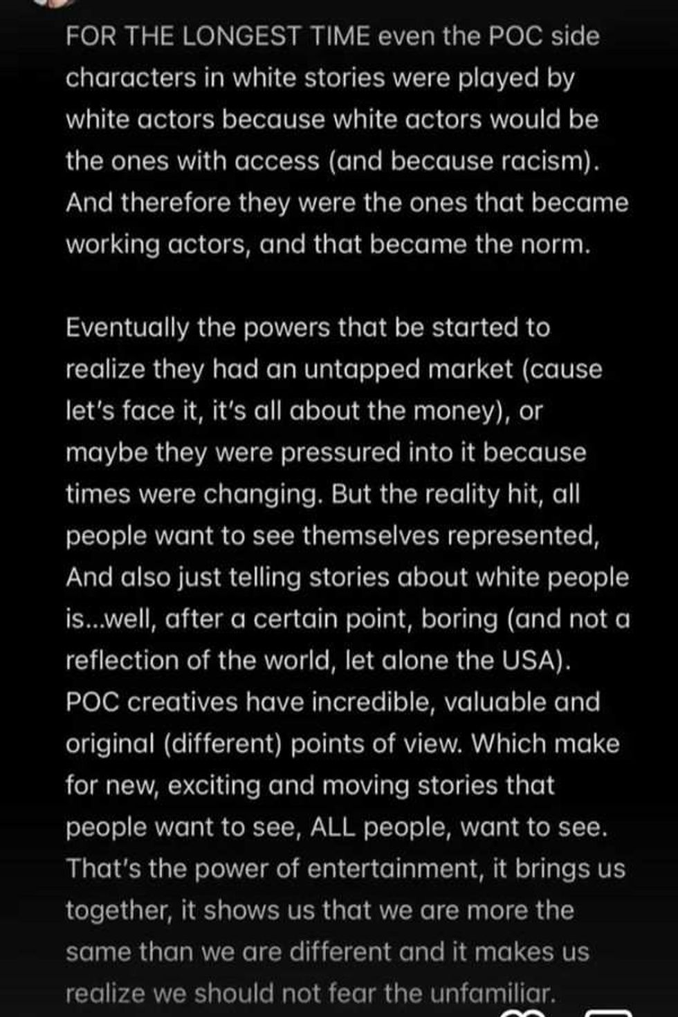 “For the longest time the only people that had the access or were given opportunities to create were white people. And so white creators would write stories about white characters (with MAYBE some POC side characters) Makes sense, and no shade to that: people should write about their own experiences. (Also I love white people, some of y’all are really cool.) But yes shade because, unfortunately that meant that POC were shut out of the industry.”