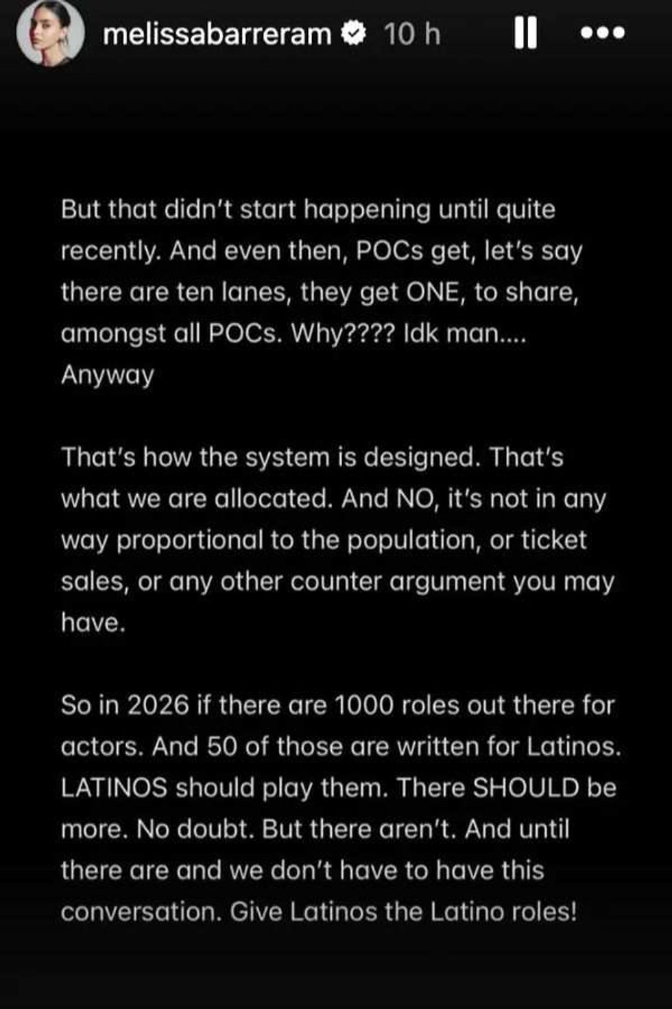 “So in 2026 if there are 1000 roles out there for actors. And 50 of those are written for Latinos. LATINOS should play them. There SHOULD be more. No doubt. But there aren’t. And until there are and we don’t have to have this conversation. Give Latinos the Latino roles!”
