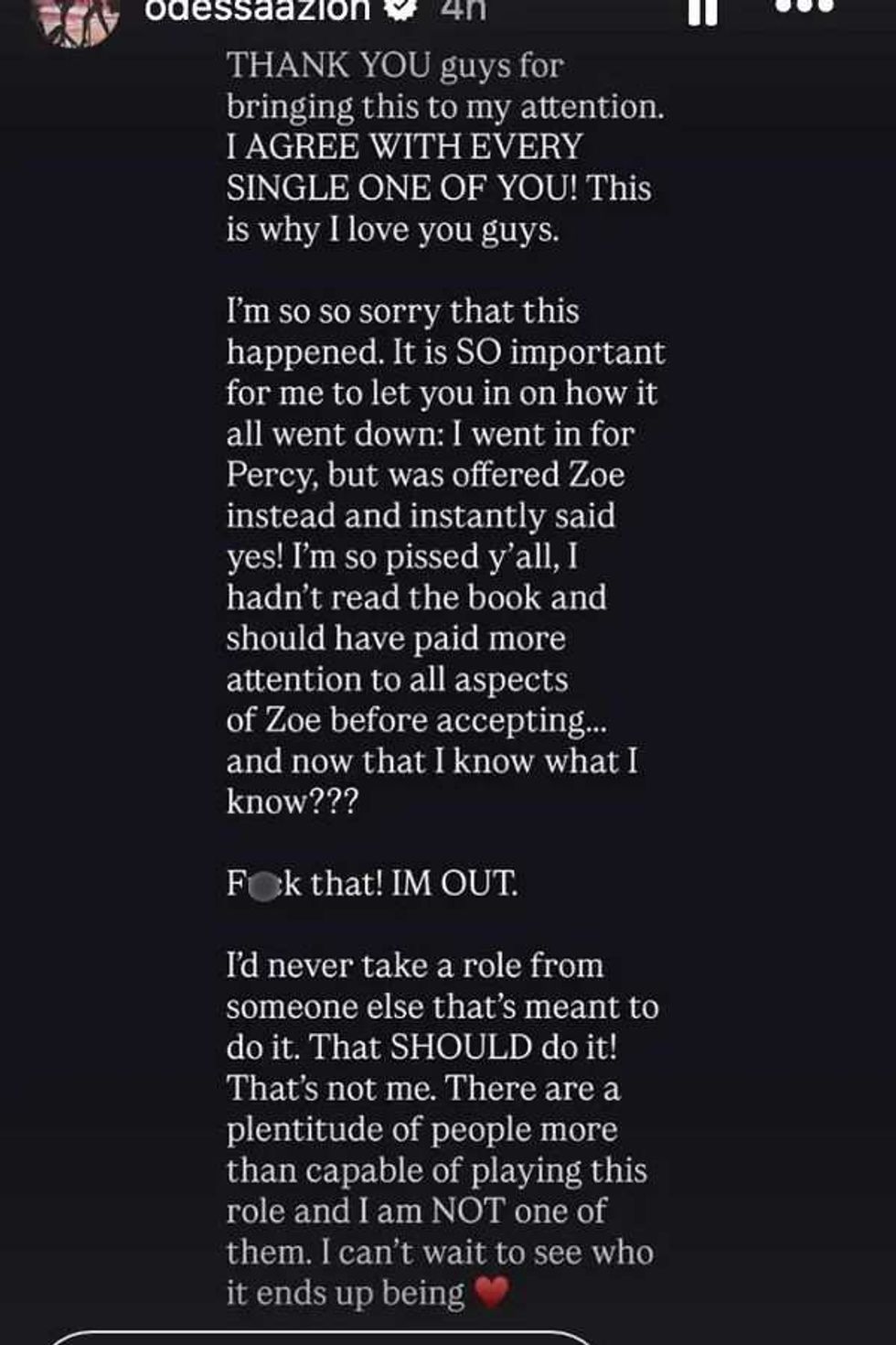 By Wednesday night, A’zion addressed the controversy directly, announcing via Instagram Stories that she was exiting the project. She explained that she had originally auditioned for a different role and said she had not been fully aware of Zoe’s identity when she accepted the part.
