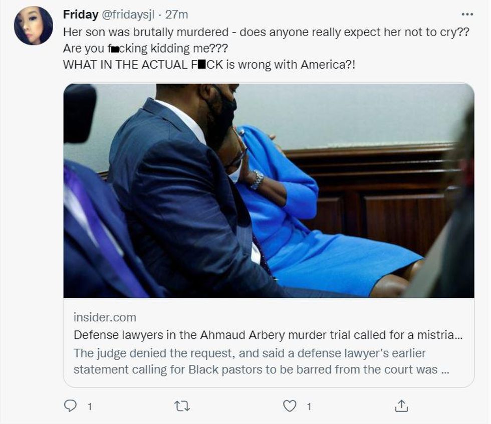 Defense lawyers in the Ahmaud Arbery murder trial called for a mistrial because Arbery's mother cried in court.https://t.co/cJO33mWZt7