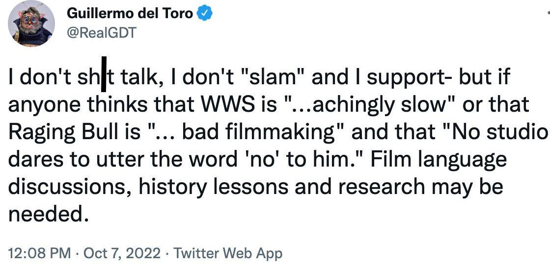 "I don't sh*t talk, I don't 'slam' and I support—but if anyone thinks that WWS is '...achingly slow' or that Raging Bull is '...bad filmmaking' and that 'No studio dares to utter the word 'no' to him.'"