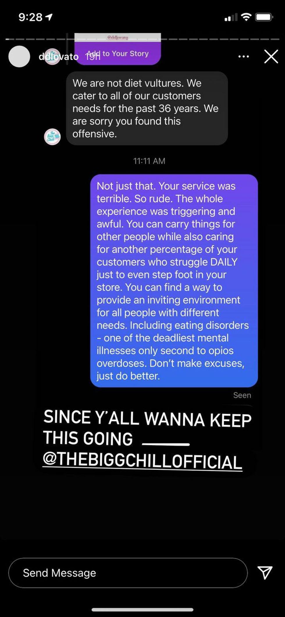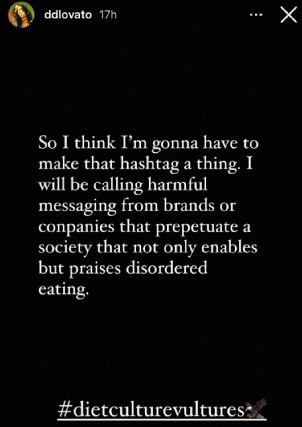 Lovato went on to coin a hashtag, "#dietculturevultures" which she said she'd use to call out businesses like The Bigg Chill who engage in harmful diet culture.