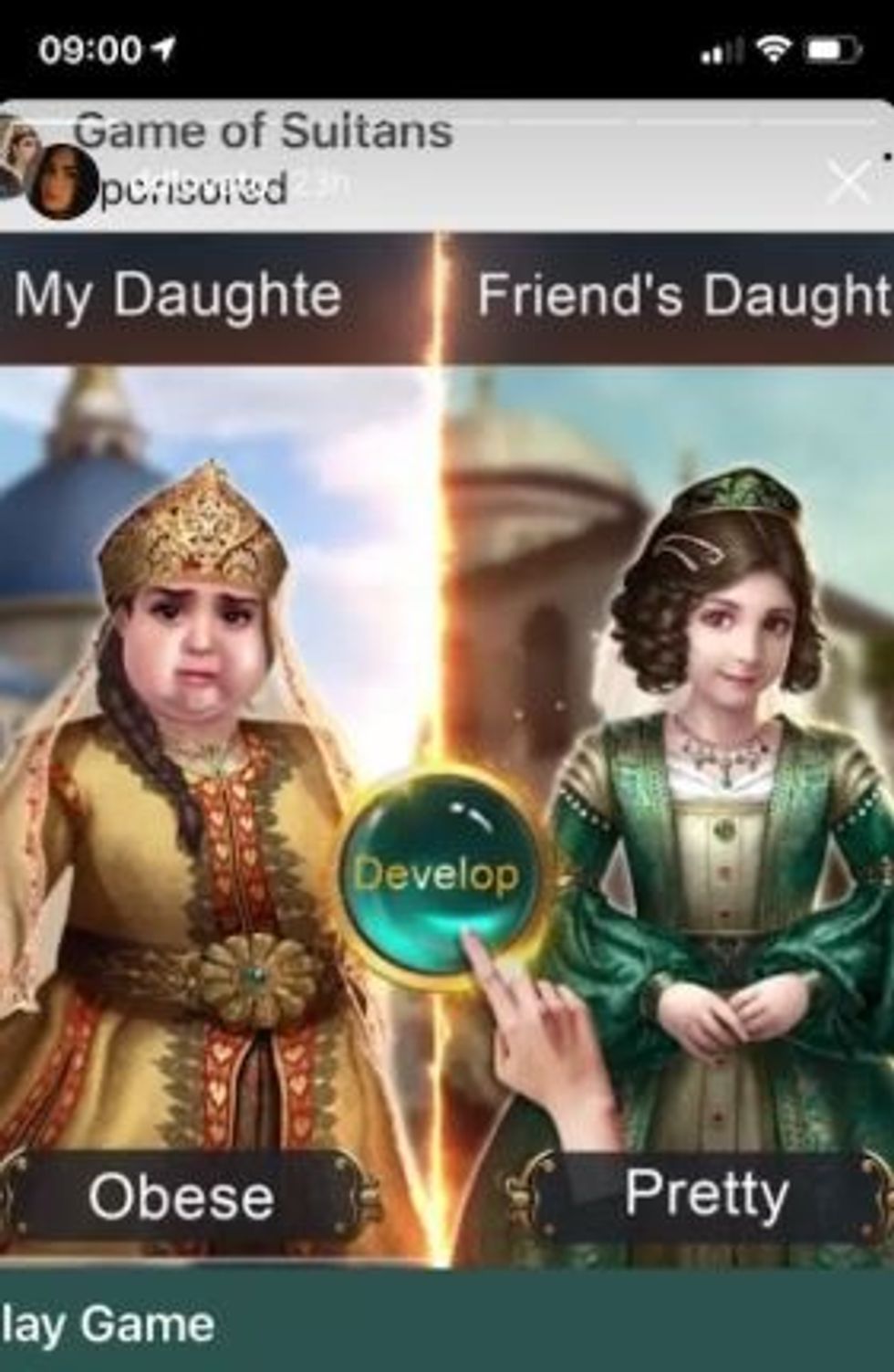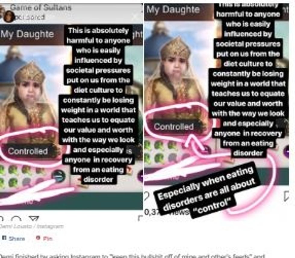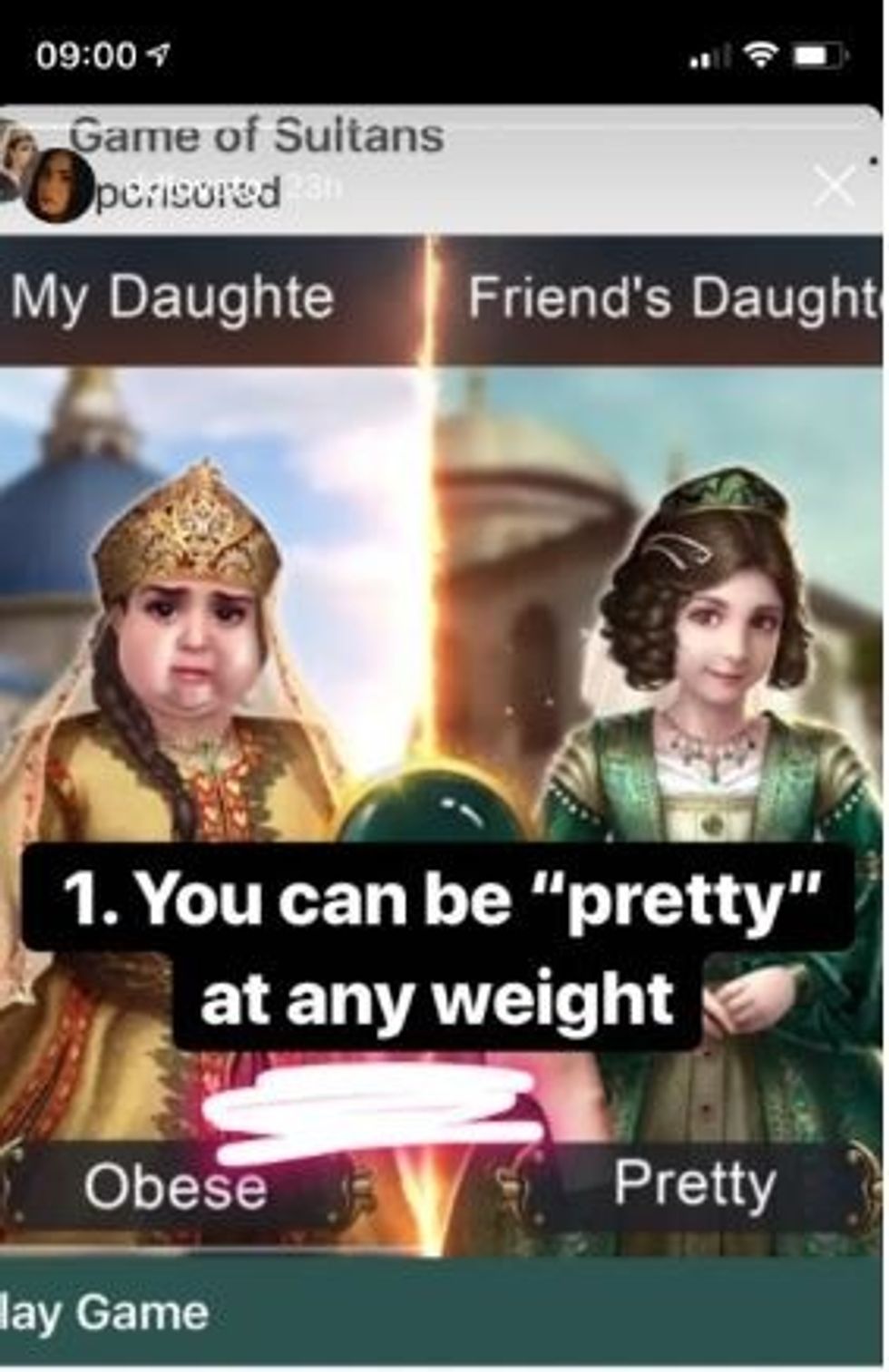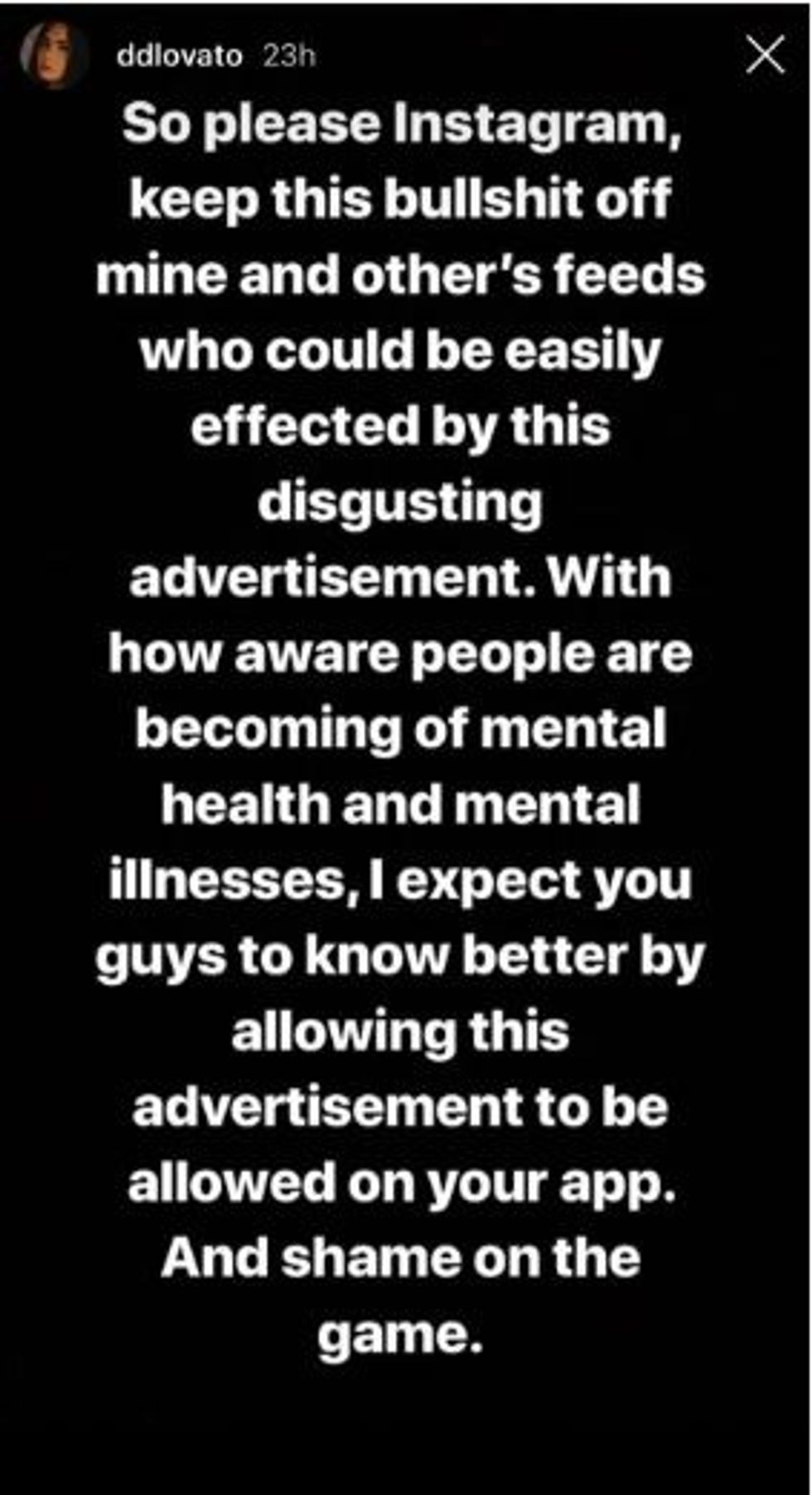Lovato, who has struggled with eating disorders in the past, was scrolling through her Instagram when a disturbing ad for the Game of Sultans popped up. In the ad women are characterized and "pretty" or "obese" and game players can decide what the characters are allowed to eat.