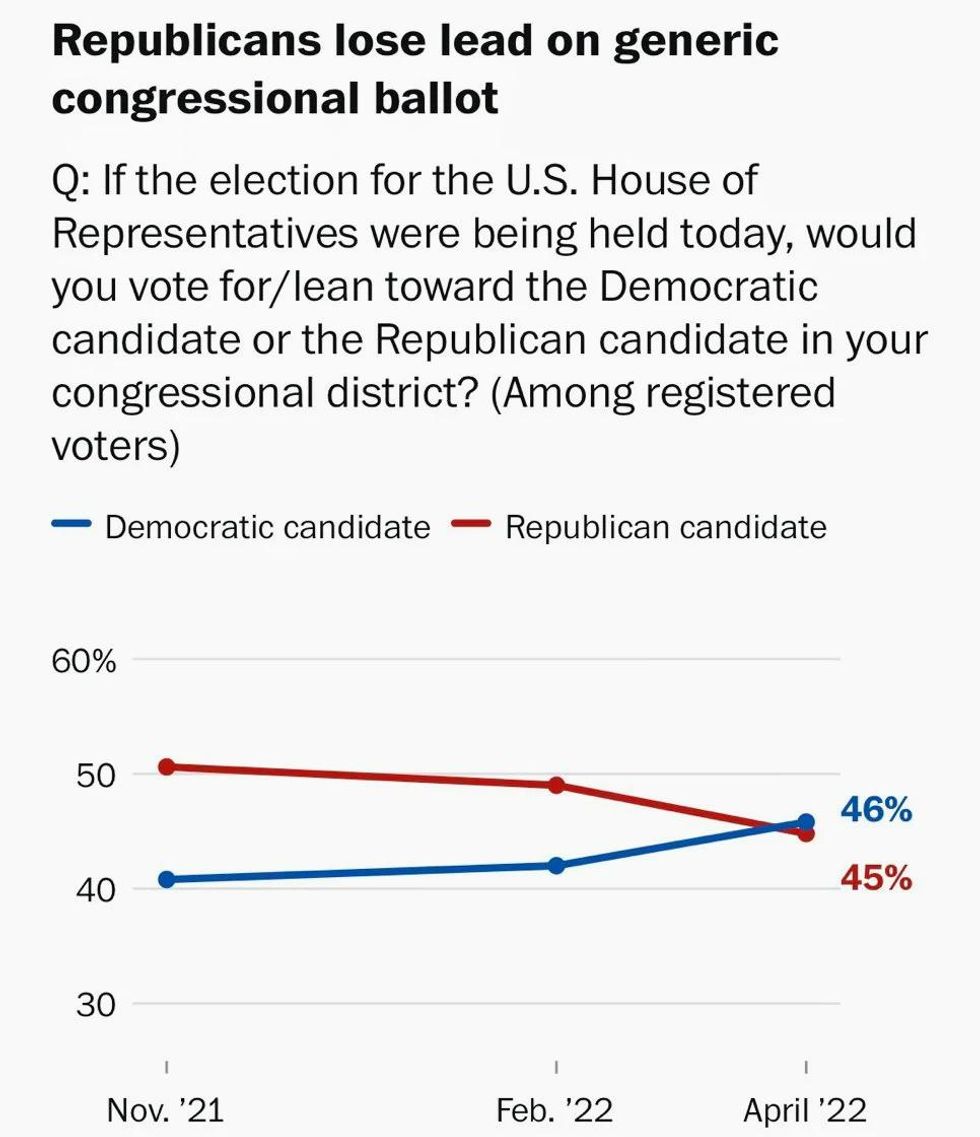 In the Washington Post-ABC Congressional preference tracking poll, the 10 point lead enjoyed by the GOP as of last November has evaporated, with the Democrats now polling one point ahead of the GOP.