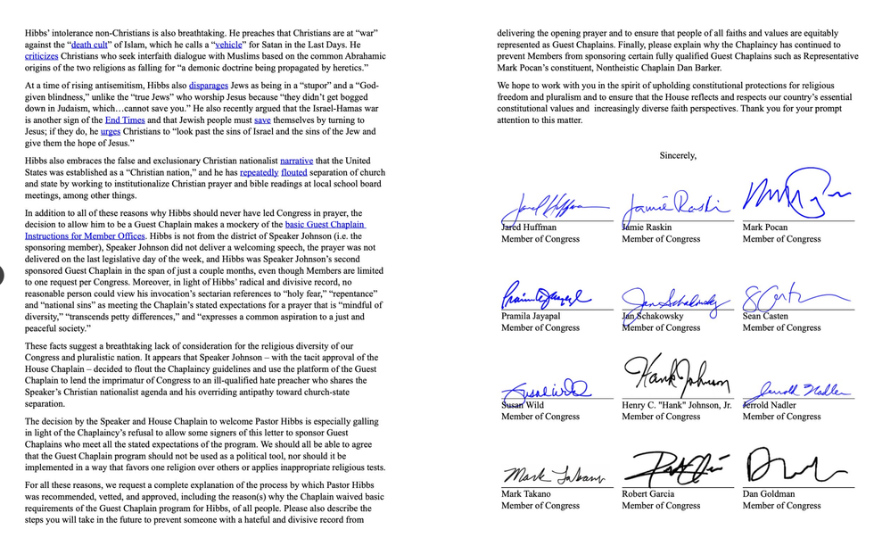 Democrats called out GOP House Speaker Mike Johnson for sponsoring Christian Nationalist Pastor Jack Hibbs to serve as a Guest Chaplain for the House.