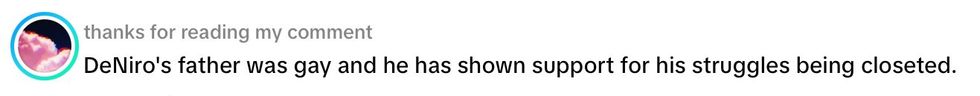 Robert De Niro has previously expressed support for his LGBTQ+ family. In 2019, he shared fears for his gay son during the Trump presidency, and in 2014, spoke of wishing he’d had deeper conversations with his own gay father.